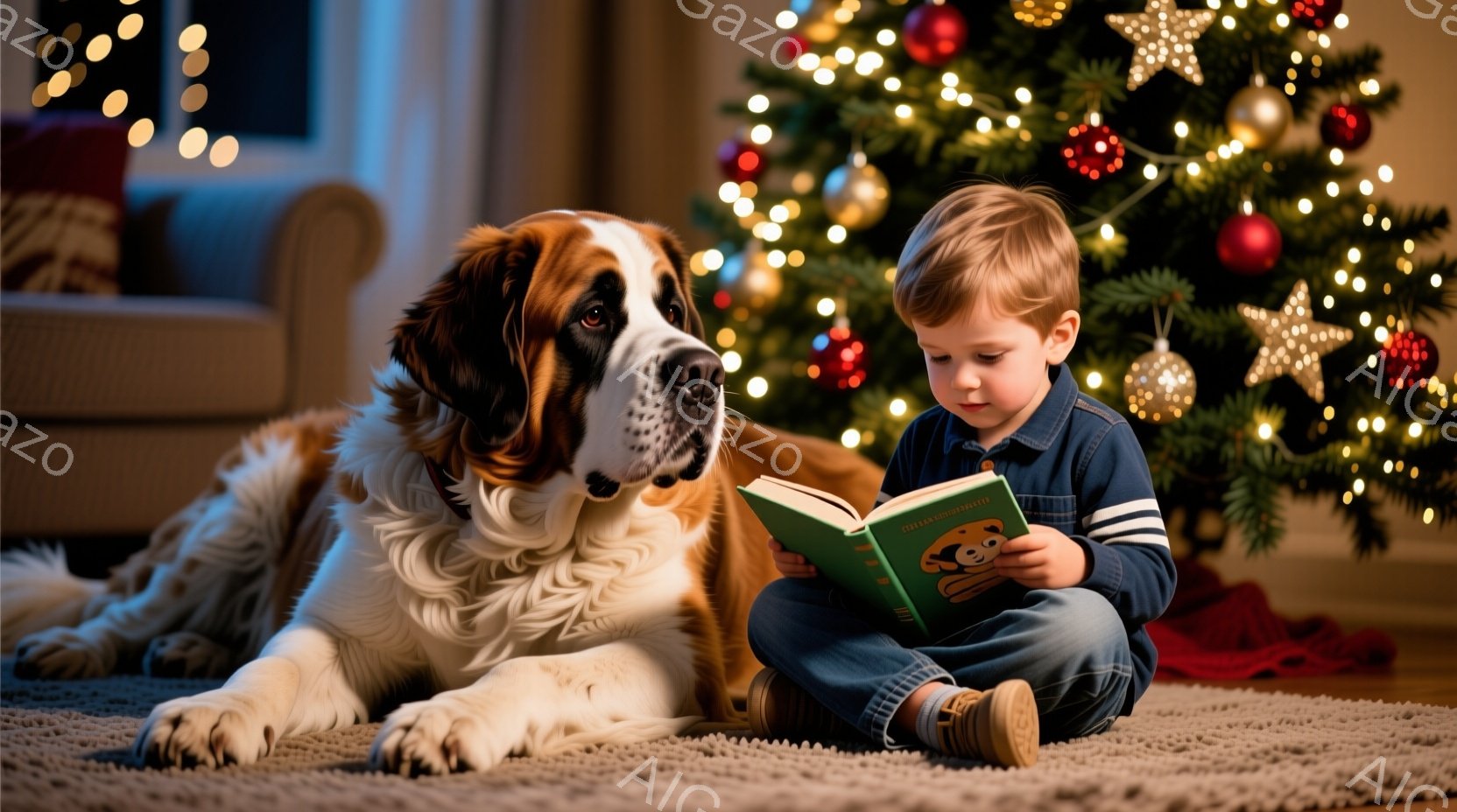 少年は床に座り、大きな絵本を熱心に読んでいます。隣には大きなセントバーナード犬が横たわり、穏やかな表情で少年の読書を見守っています。背景にはクリスマスツリーが輝き、暖炉の炎が温かい光を投げかけ、部屋全体がクリスマスの雰囲気に包まれています。