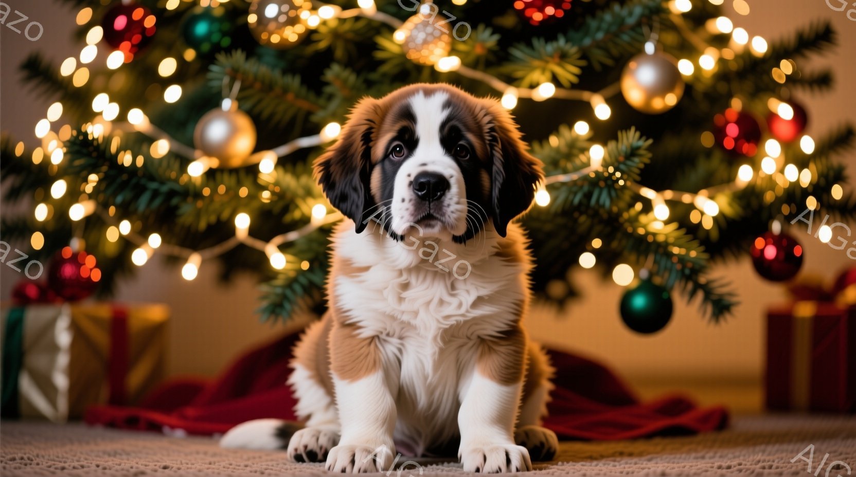 幼いセント・バーナード犬が、赤い毛布の上に座って正面を見つめている。背景には、オーナメントや光で飾られたクリスマスツリーがあり、プレゼントの箱も見える。暖かく、お祝いの雰囲気が漂う、優しい光に包まれた写真である。