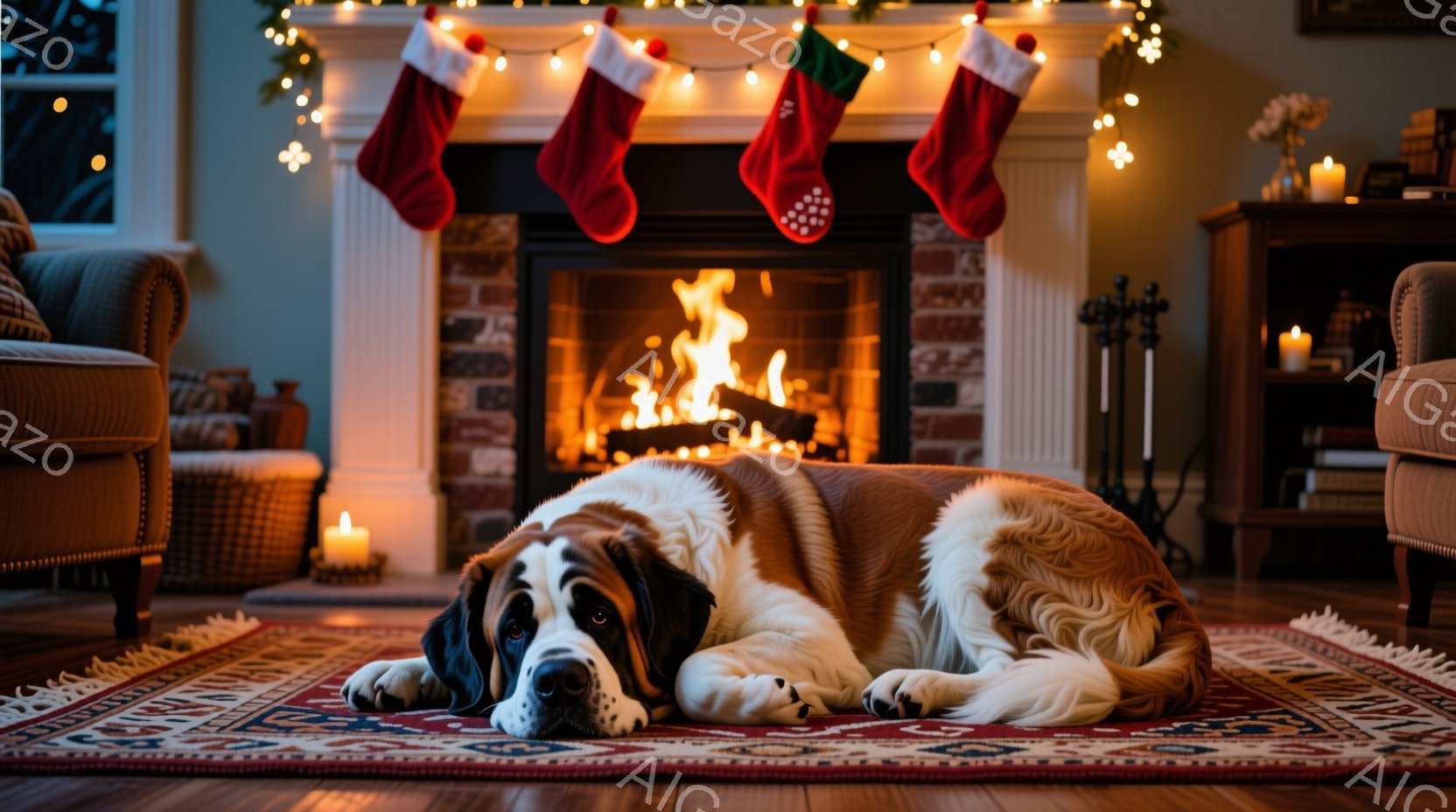 暖炉の前でセントバーナード犬が横たわっており、赤い模様のラグの上にリラックスした様子でいます。暖炉には火が燃えており、クリスマスソックスが暖炉の棚に飾られています。背景には、暖かい光に照らされた居間があり、クリスマスの雰囲気が漂っています。