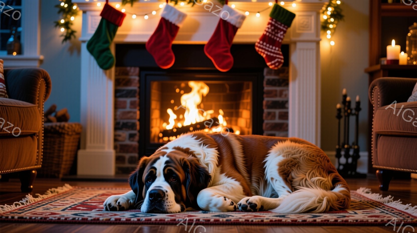 暖炉の前でセントバーナード犬がリラックスして横たわっています。背景にはクリスマスソックスが飾られた暖炉があり、居心地の良い雰囲気を作り出しています。赤い絨毯の上で犬は穏やかな表情で、温かい光に包まれています。