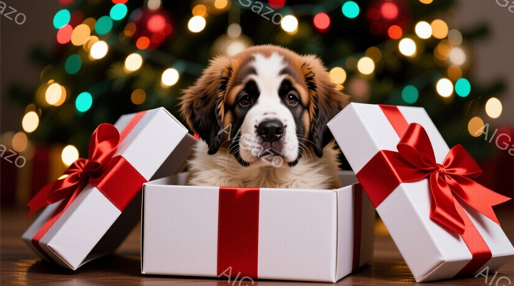 愛らしいセントバーナードの子犬が、赤いリボンで結ばれた白いギフトボックスから顔を出しています。子犬は明るい茶色の毛並みで、つぶらな瞳でこちらを見ており、とても愛らしい表情をしています。背景にはぼやけたクリスマスツリーの光が広がり、温かく、お祝いムード満点の雰囲気を醸し出しています。