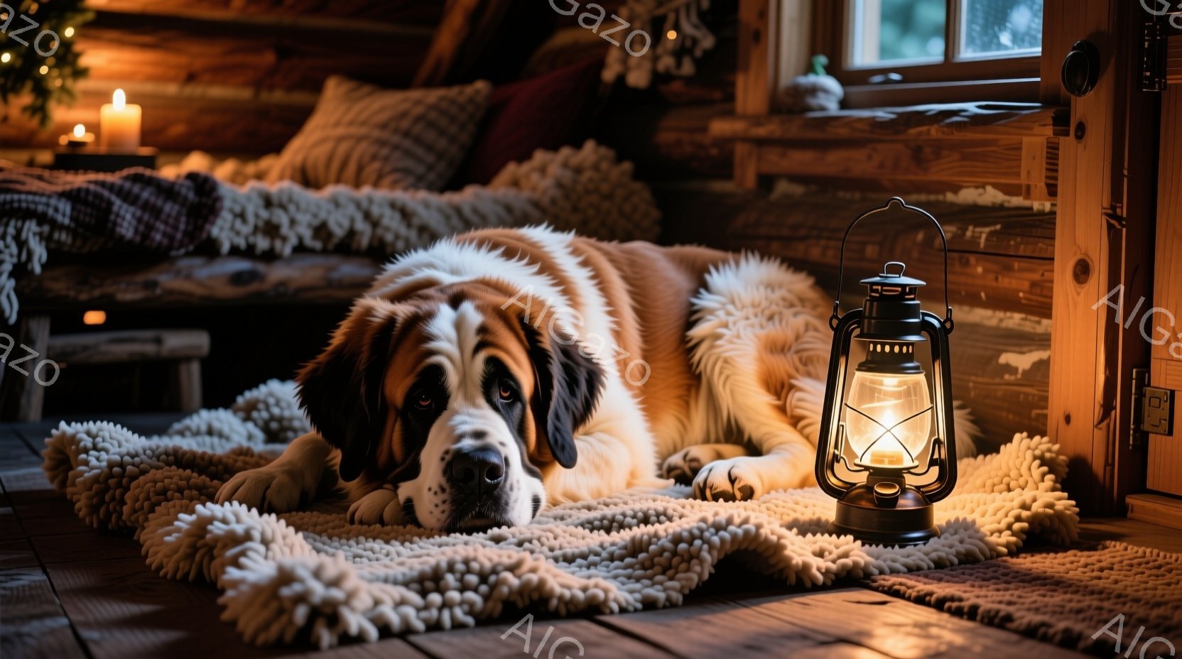 白い毛並みで大きなセント・バーナード犬が、頭にサンタ帽をかぶり、雪の中を元気に走っている。背景には、飾り付けられたクリスマスツリーと雪が積もった庭があり、冬の暖かい雰囲気を醸し出している。犬は口を開け、嬉しそうに雪の中を駆け抜けている様子が捉えられている。