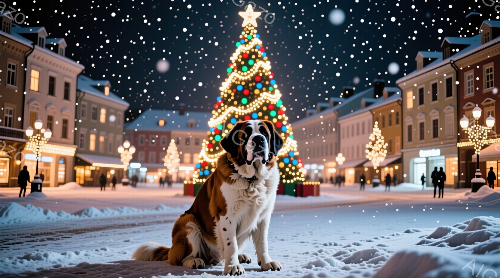 雪が舞う夜の街並みの中に、セント・バーナード犬が座っています。犬は穏やかな表情で正面を見つめ、周囲のクリスマスイルミネーションと雪景色の中でひときわ存在感を放っています。背景には、ライトアップされた建物やクリスマスツリーが並び、暖かい祝祭の雰囲気が漂っています。