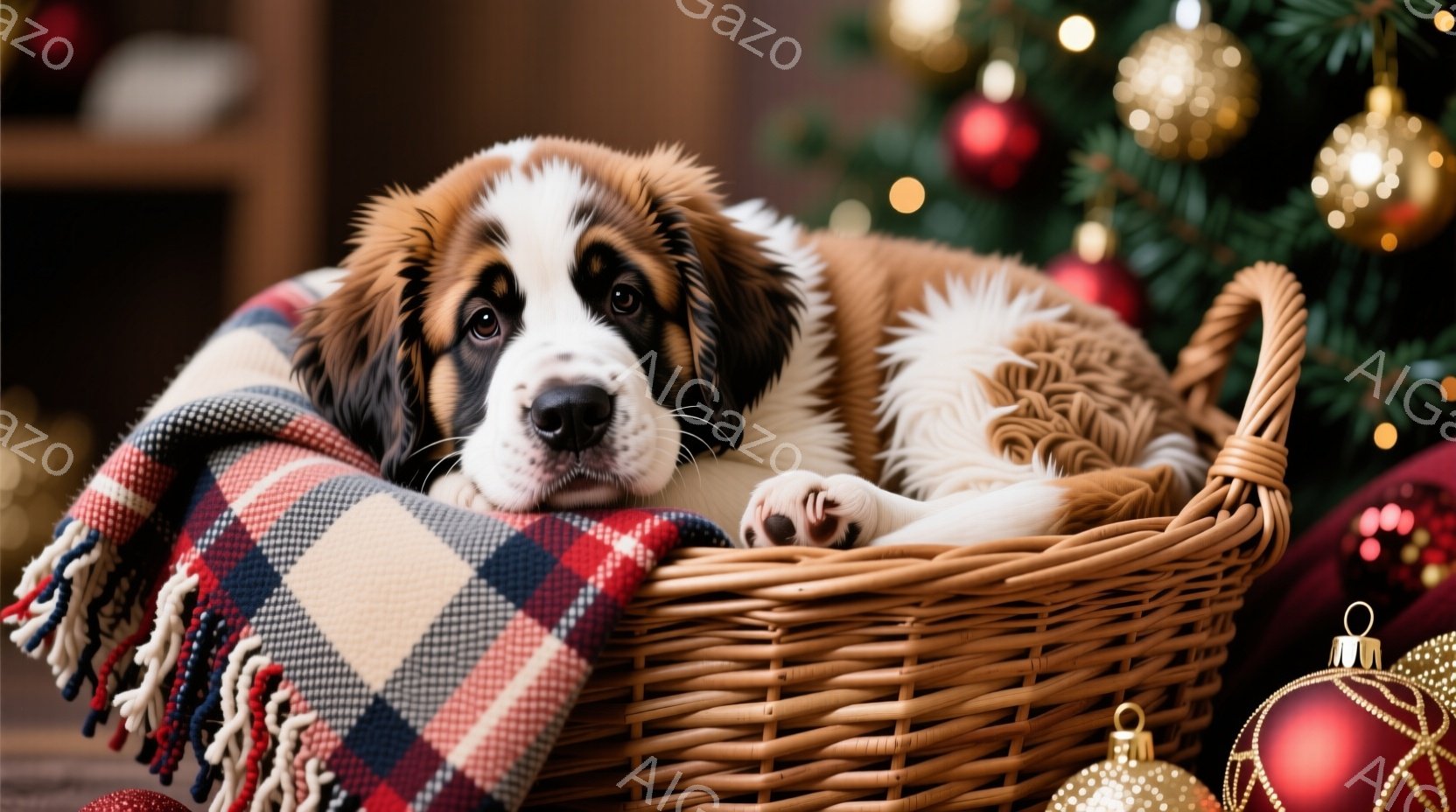 籐の籠に、毛並みの美しいセントバーナードの子犬が横たわっています。赤いチェック柄のブランケットが敷かれており、子犬はリラックスした表情でカメラを見つめています。背景にはクリスマスツリーとオーナメントがあり、温かく、お祝いムードに満ちた雰囲気です。