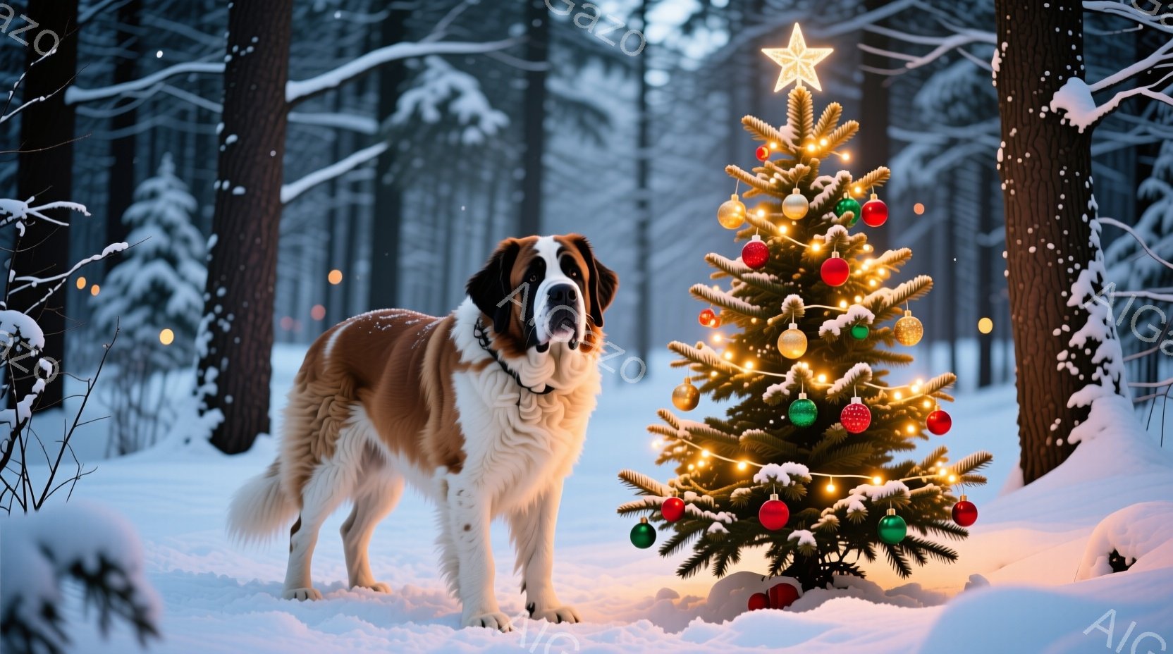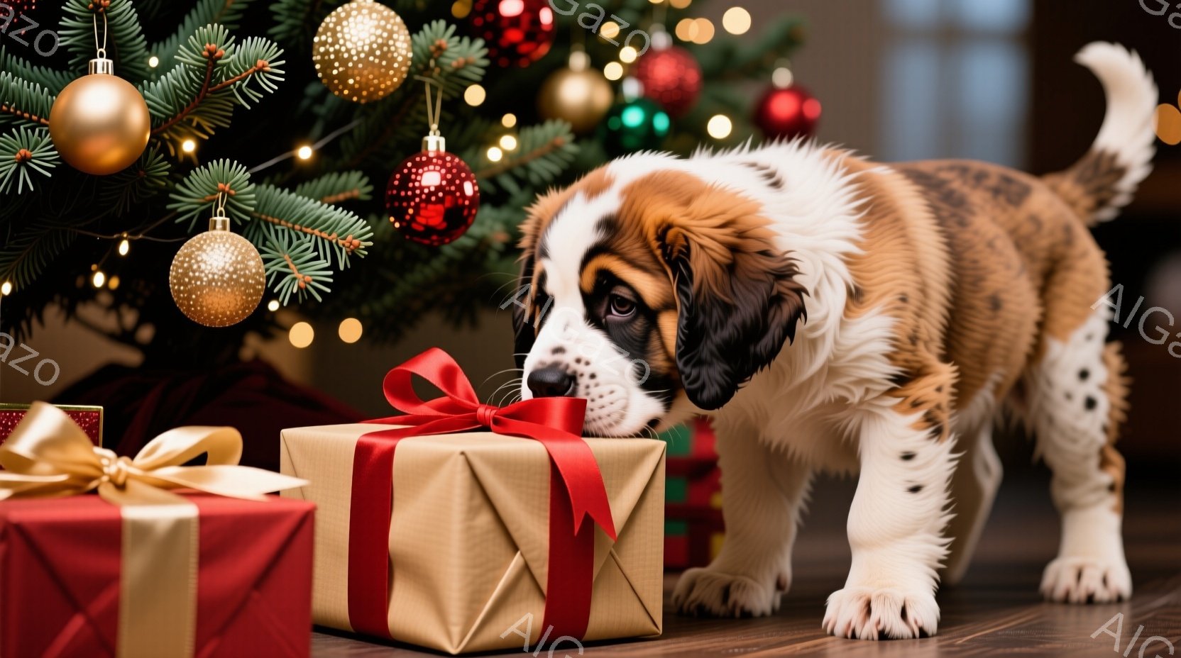 クリスマスツリーの足元に置かれたプレゼントの箱を嗅ぐセント・バーナードの子犬が写っています。子犬は茶色と白の毛並みで、好奇心に満ちた表情で箱に鼻を近づけています。背景には、飾り付けられたクリスマスツリーがあり、暖かくお祝いの雰囲気です。