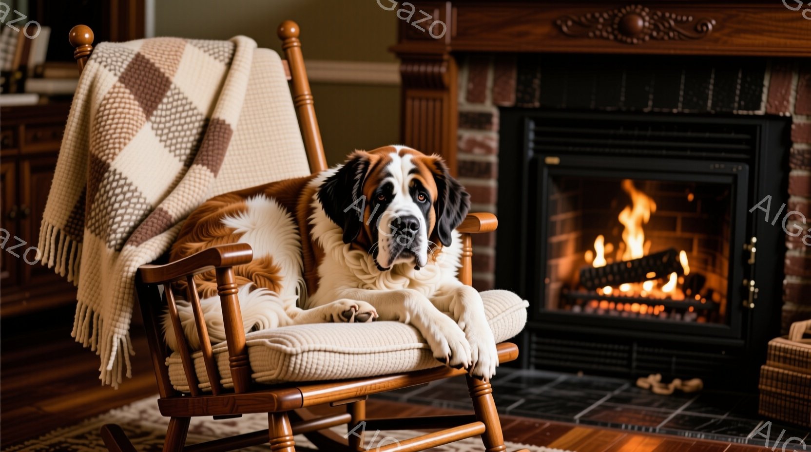 大きなセントバーナード犬がロッキングチェアに横たわり、リラックスした様子で頭を腕に乗せています。ロッキングチェアにはベージュ色のブランケットが掛けられ、暖炉の炎が背景に暖かさを添えています。部屋全体が落ち着いた雰囲気で、冬の穏やかな午後のような光景です。