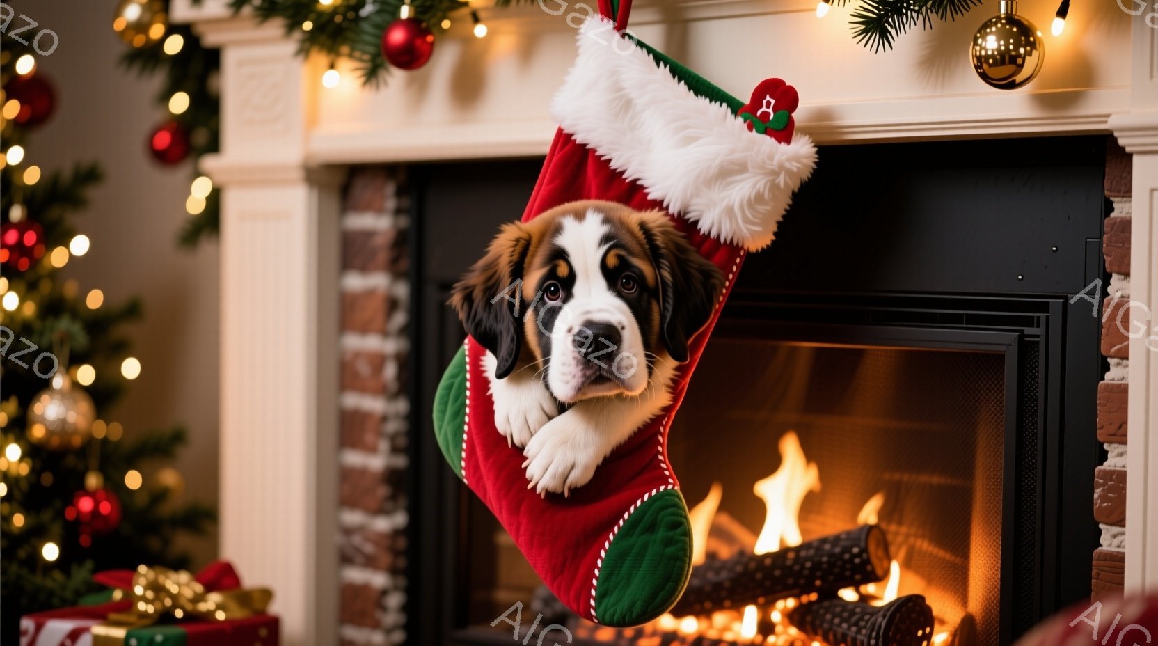 暖炉のそばに飾られたクリスマスストッキングの中に、子犬が顔を出しています。子犬は茶色と白の毛並みで、好奇心と少し戸惑った表情でこちらを見ています。背景にはクリスマスツリーの飾りやプレゼント、そして暖炉の炎が暖かく光っており、クリスマスの温かい雰囲気が漂っています。