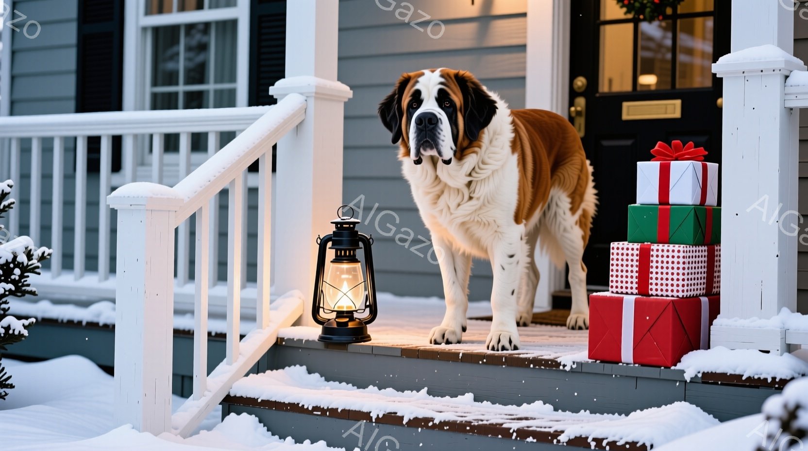 雪が舞う家の玄関前に、プレゼントの山とランタンが置かれ、その隣に大きなセントバーナード犬が立っている。犬は茶色と白の毛並みを持ち、まっすぐ前を見つめている表情は穏やかで、冬の暖かい雰囲気を醸し出している。背景には雪に覆われた家と、クリスマスの飾り付けが施された玄関ドアが見える。