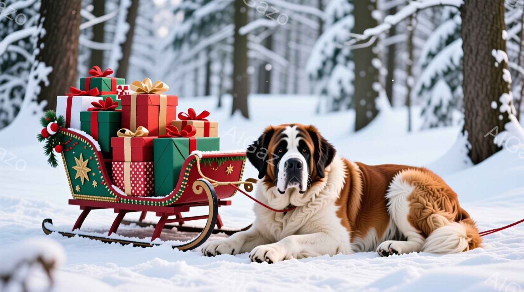 雪景色の中に、プレゼントの山を積んだそりが置かれています。そのそばには、首に赤いリボンをつけたセントバーナード犬が横たわり、穏やかな表情でこちらを見ています。背景には雪に覆われた木々が広がり、暖かく、平和な冬の雰囲気を醸し出しています。