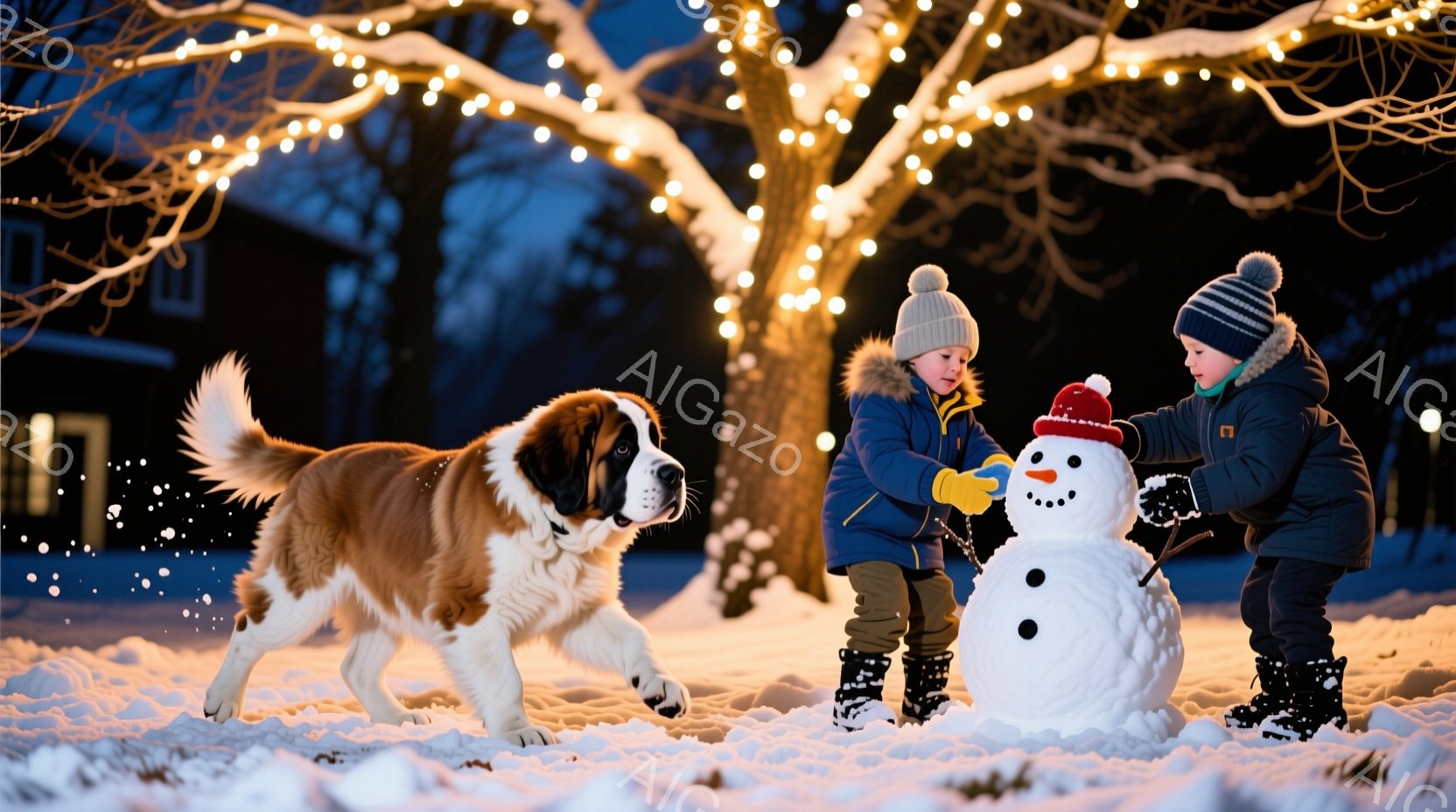 雪景色の中で、二人の子供と一匹の大型犬が雪だるまを作っている様子が描かれています。子供たちは冬用の帽子、ジャケット、ズボン、ブーツを着用し、雪だるまの顔を作るのに熱心に取り組んでいます。背景には木の枝に飾られた温かい光のイルミネーションが輝き、雪が降る静かで穏やかな冬の夜の雰囲気を醸し出しています。
