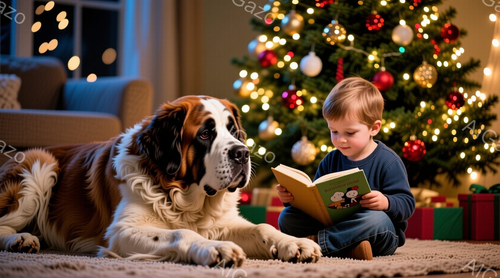 少年が床に座り、絵本を読んでいます。大きなセントバーナード犬が少年の横に横たわり、絵本に興味津々な様子で少年を見つめています。背景にはクリスマスツリーが飾られ、温かく穏やかな家庭の雰囲気が漂っています。