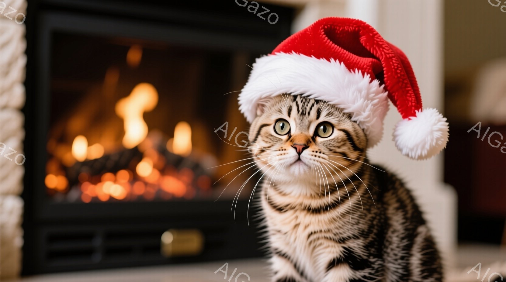 縞模様の猫が、赤いサンタ帽をかぶって正面を見つめている。猫は柔らかいカーペットの上に座り、少し警戒したような表情をしている。背景には暖炉があり、燃え盛る炎が猫の姿を温かく照らし出している。