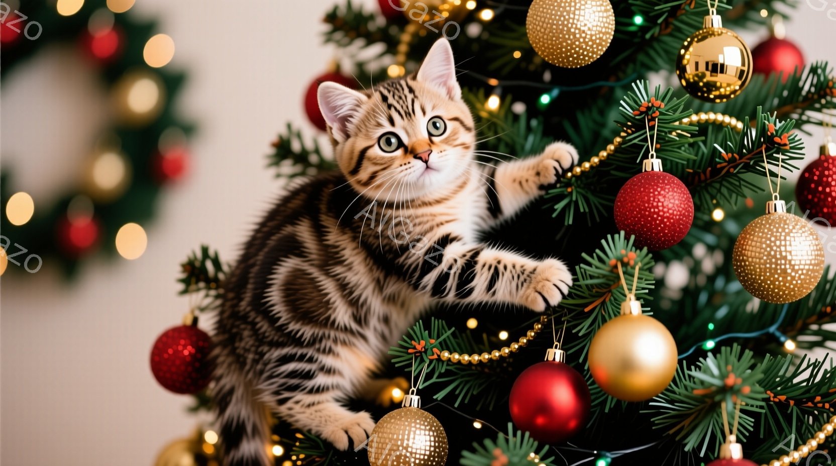 クリスマスツリーによじ登っている子猫が写っています。縞模様の毛並みで、好奇心と遊び心にあふれた表情で、前足でツリーの枝についた赤いオーナメントに手を伸ばしています。背景にはぼやけたクリスマスソックスが見え、全体的に暖かく、遊び心のあるクリスマスの雰囲気が漂っています。