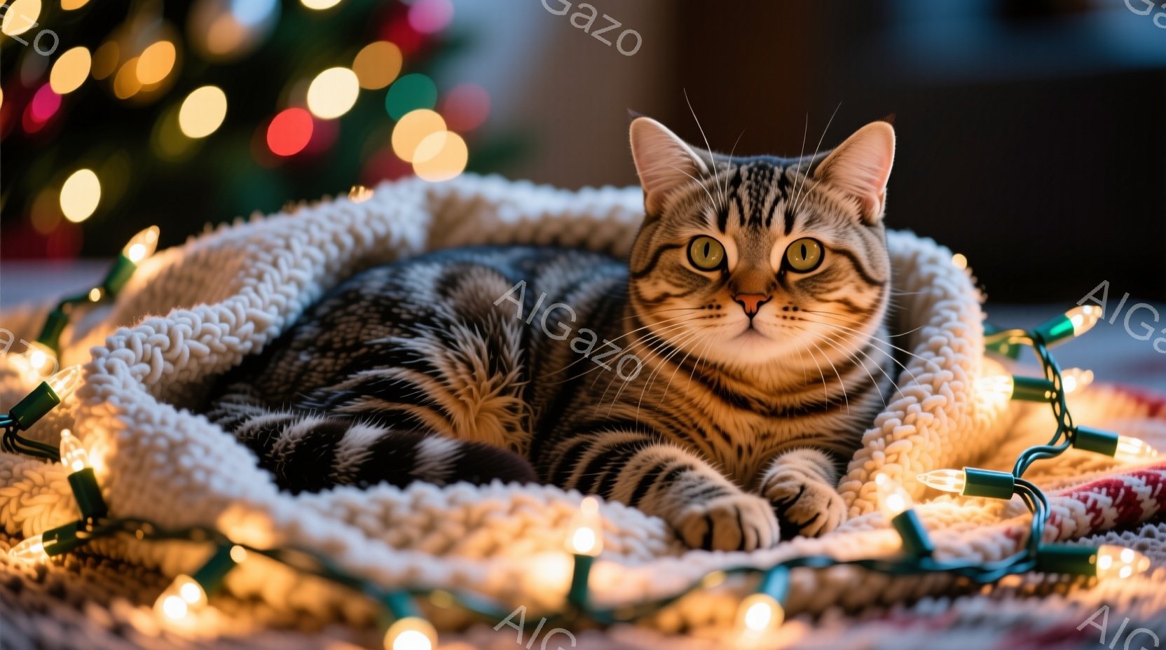 縞模様の猫が、白いフワフワとしたベッドに丸まってリラックスして横たわっています。猫は緑色の目を輝かせ、穏やかな表情をしています。背景には、ぼやけたクリスマスツリーと光る電飾があり、暖かく、居心地の良い雰囲気を醸し出しています。