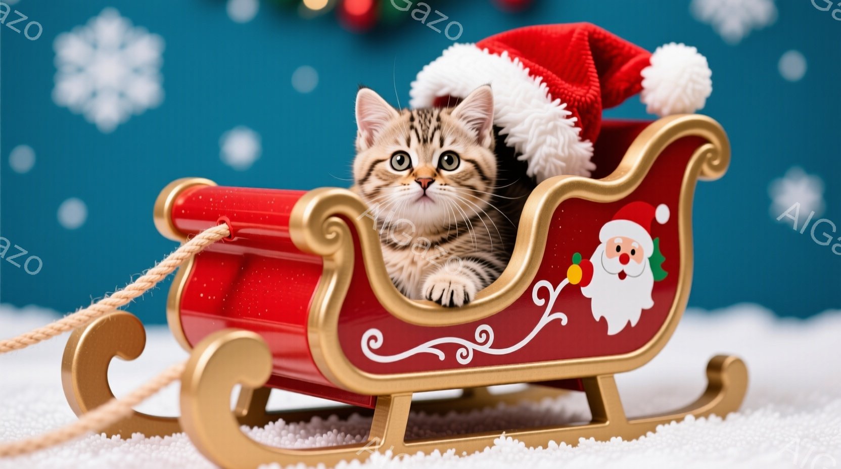 赤いソリに乗った縞模様の子猫が描かれています。子猫は赤いサンタ帽をかぶり、前足をソリの縁につかまって座っており、好奇心と少し戸惑った表情をしています。背景は水色のグラデーションで、白い雪の結晶が散りばめられており、冬の温かく遊び心のある雰囲気を醸し出しています。