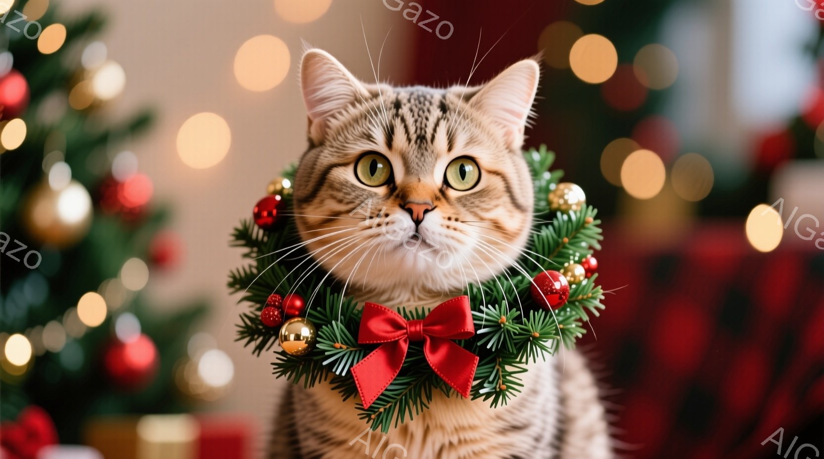 この無料AI生成画像「縞模様の猫が窓辺に座り、正面を見ています。背景には雪景色が広がり、窓枠にはカラフルなイルミネーションライトが飾られています。クリスマスの飾りが添えられた暖かく穏やかな雰囲気の冬の情景です。」は、2025年10月22日に作成されました。 サイズは 1664×928px の高解像度で、商用利用も可能なフリー素材として提供しています。