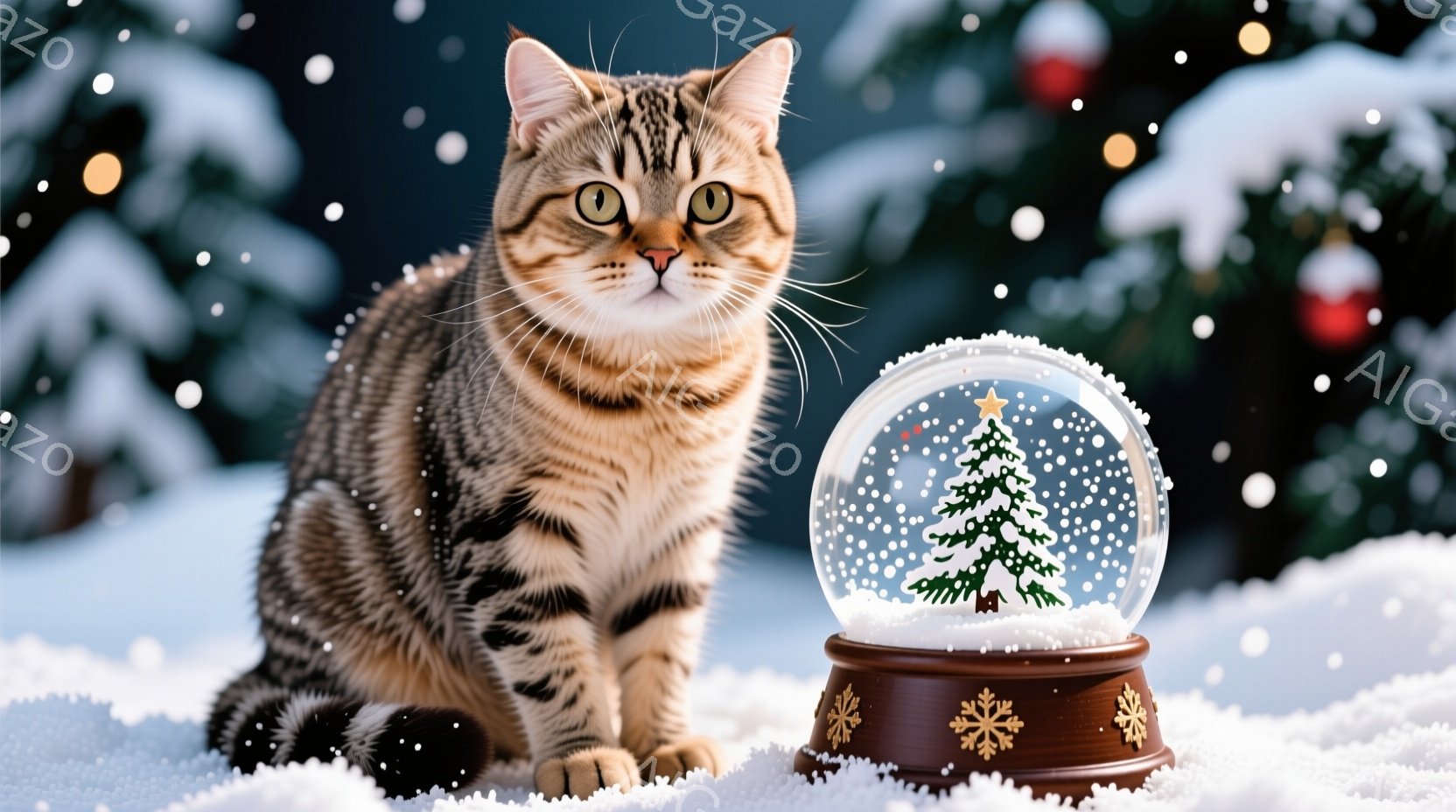 縞模様の茶色の猫が雪の上に座っており、わずかにカメラを見つめている。その隣には、中に小さなクリスマスツリーが入った雪の玉が置かれている。背景は雪に覆われた風景で、ぼやけた緑の木々が見え、全体的に冬の穏やかな雰囲気を醸し出している。