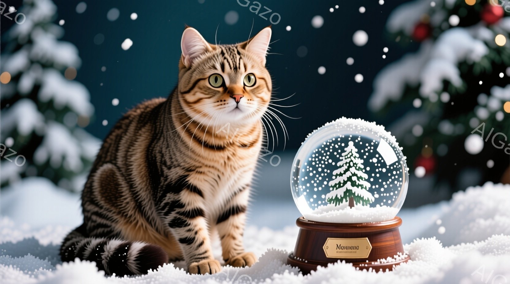 縞模様の猫が雪の上に座っており、リラックスした表情で正面を見つめています。猫の隣には、中に小さなクリスマスツリーが入った雪の玉が置かれており、背景にはぼやけたクリスマスツリーと雪が降る冬の風景が広がっています。全体的に、暖かく、お祝いムードにあふれたクリスマスの雰囲気の画像です。