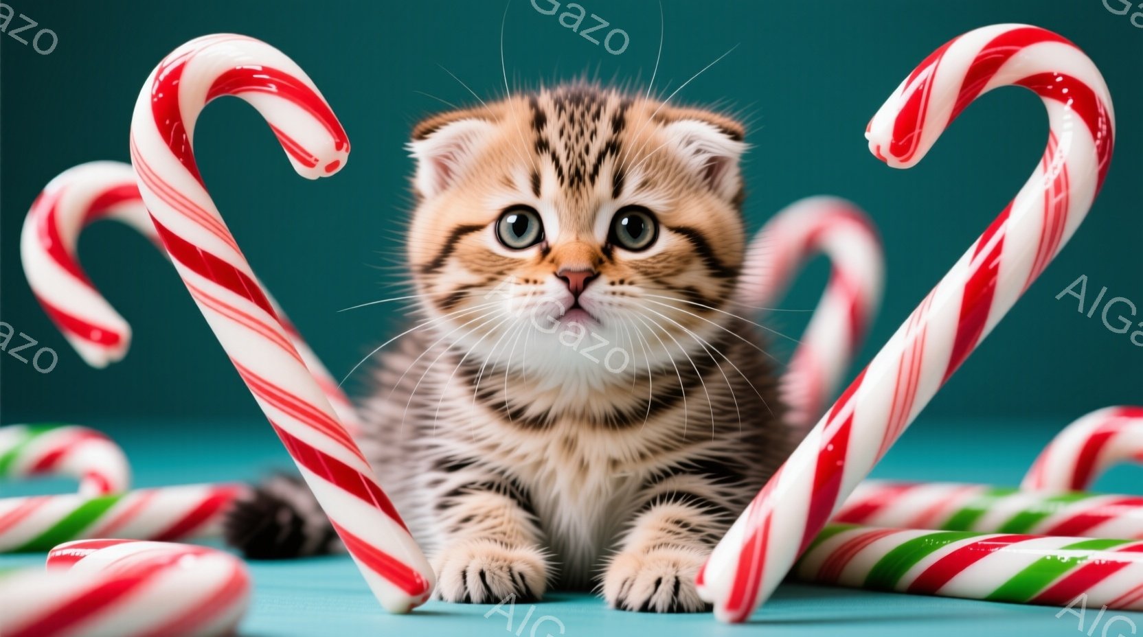 小柄な縞模様の子猫が、赤と白のキャンディケーンに囲まれて床に横たわっています。子猫は大きな緑色の瞳でカメラを見つめ、リラックスした表情をしています。背景にはぼやけたクリスマスツリーと輝くオーナメントが見え、温かくお祝いムードを醸し出しています。