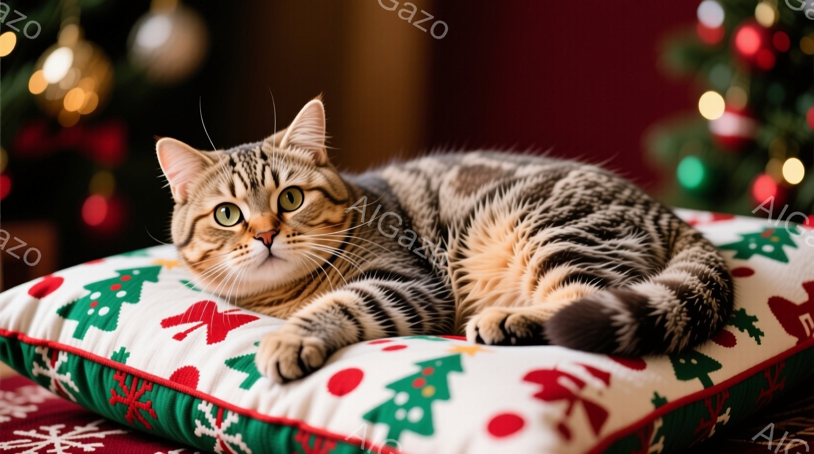 明るい背景に、縞模様の猫が赤いクリスマス柄のクッションの上で横たわっています。猫はリラックスした表情で、前足を揃えて体を伸ばしています。背景にはぼやけたクリスマスツリーの光が散りばめられ、温かく穏やかな雰囲気が漂っています。