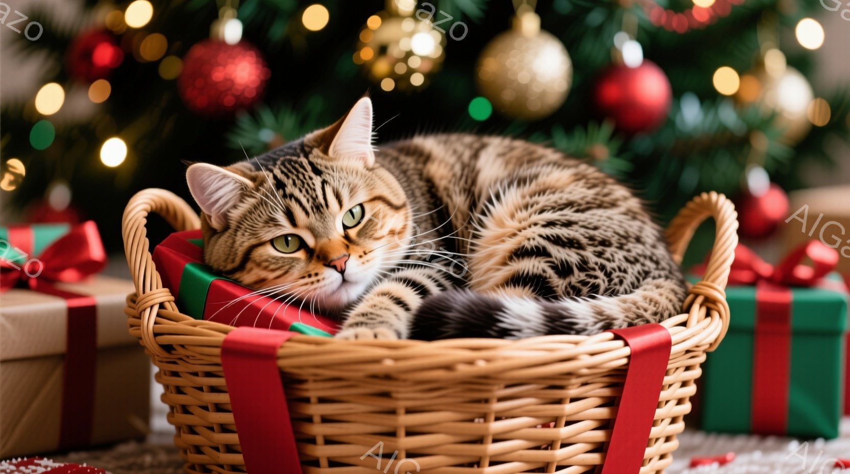 茶色の縞模様の猫が、赤いリボンと緑色の包装紙で飾られたプレゼントがいくつか入った籐のバスケットの中に横たわっています。猫は目を細めてリラックスした表情をしており、毛並みは光沢があり、しなやかな曲線を描いています。背景には、金色のオーナメントと赤い飾りで飾られたクリスマスツリーがぼやけており、温かく、お祝いの雰囲気を醸し出しています。