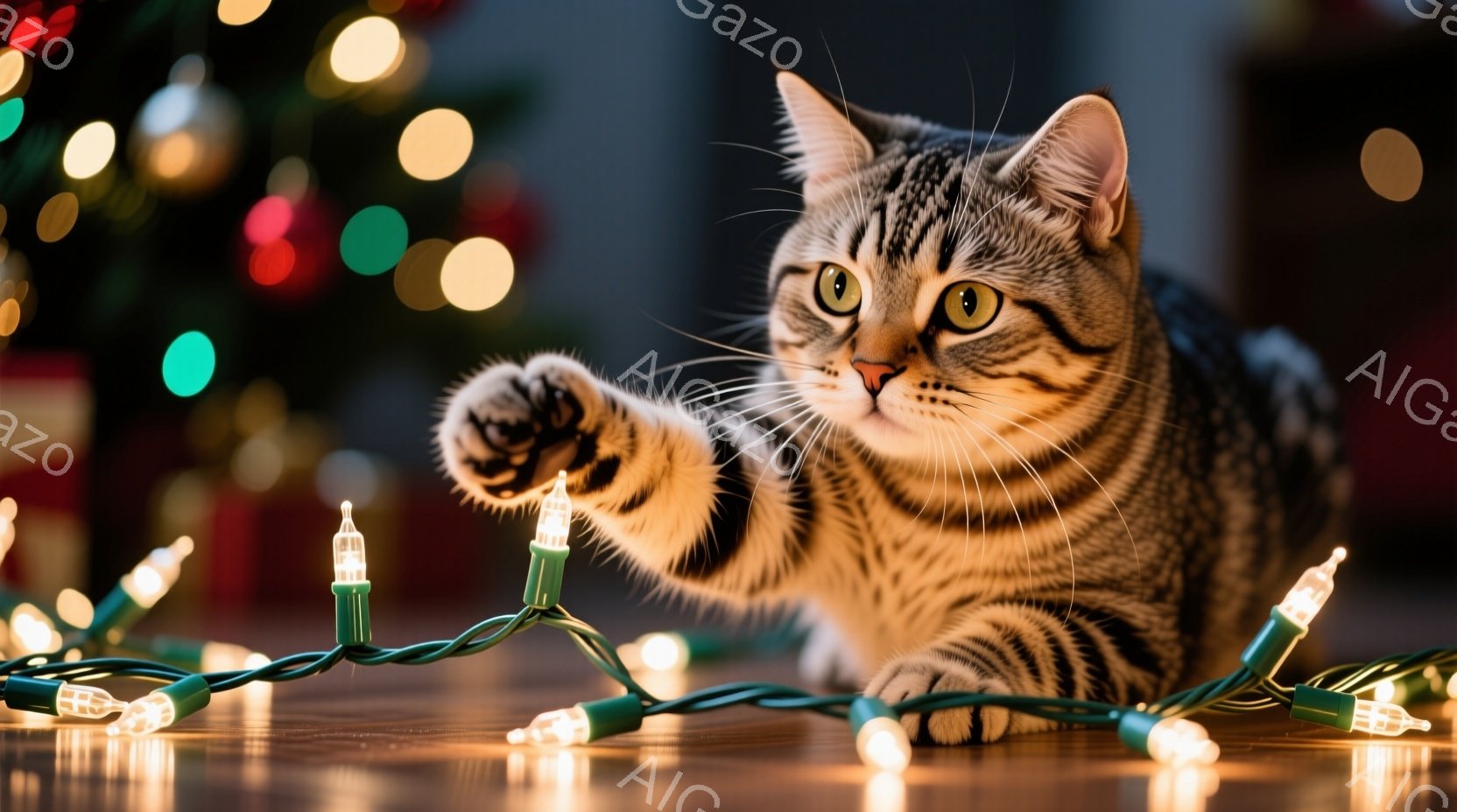 縞模様の猫が、白いクリスマスライトの串を前足で軽く叩いている様子が写っている。猫は少し上目遣いで、興味津々な表情でライトを見つめており、背景はぼやけたカラフルな光で満たされている。全体的に、暖かく、遊び心のある、お祝いの雰囲気が漂っている。