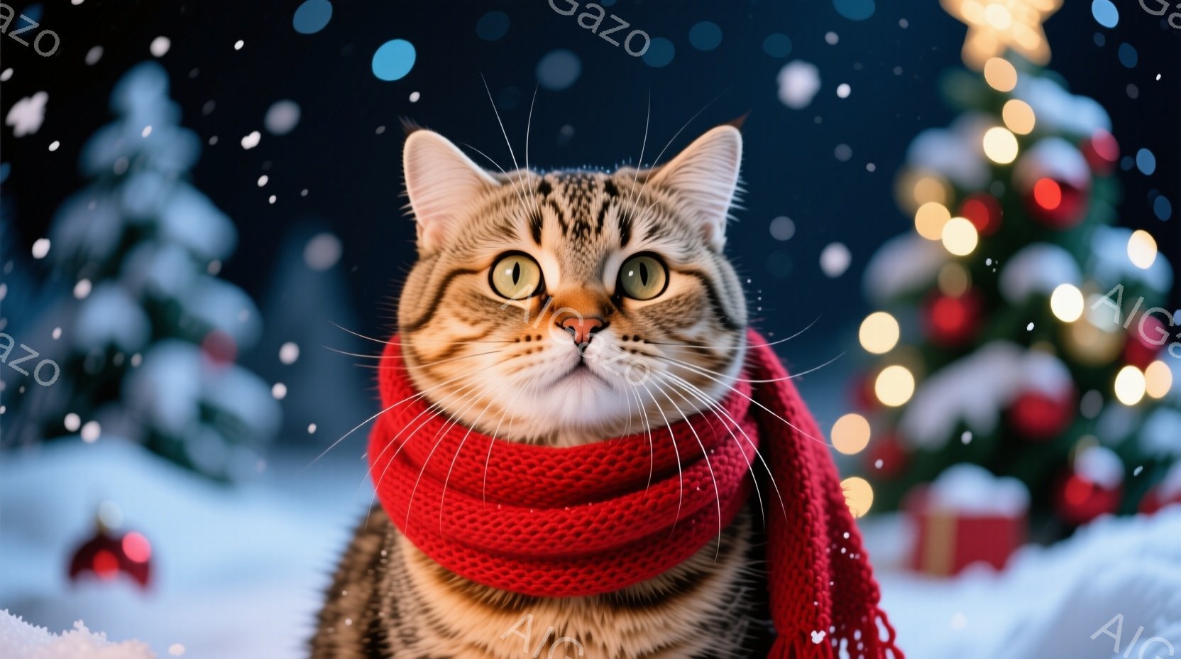 縞模様の猫が赤い編みマフラーを巻いており、緑色の目をカメラに向かって見つめています。背景にはぼやけたクリスマスツリーと雪が舞う冬の風景が広がり、暖かく優しい雰囲気を醸し出しています。猫はまっすぐ前を見据え、穏やかでリラックスした様子が伺えます。