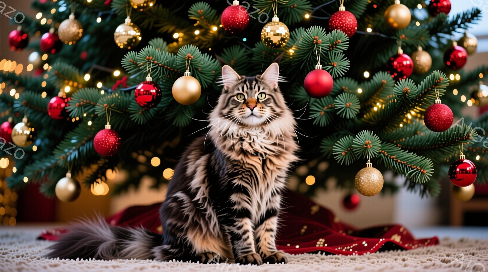 長毛の縞模様の猫が、クリスマスツリーの前に座っています。猫はまっすぐ前を見ており、緑色の瞳が印象的です。背景には、赤や金のオーナメントで飾られたクリスマスツリーと、赤いギフトボックスが見え、温かく華やかなクリスマスの雰囲気が漂っています。