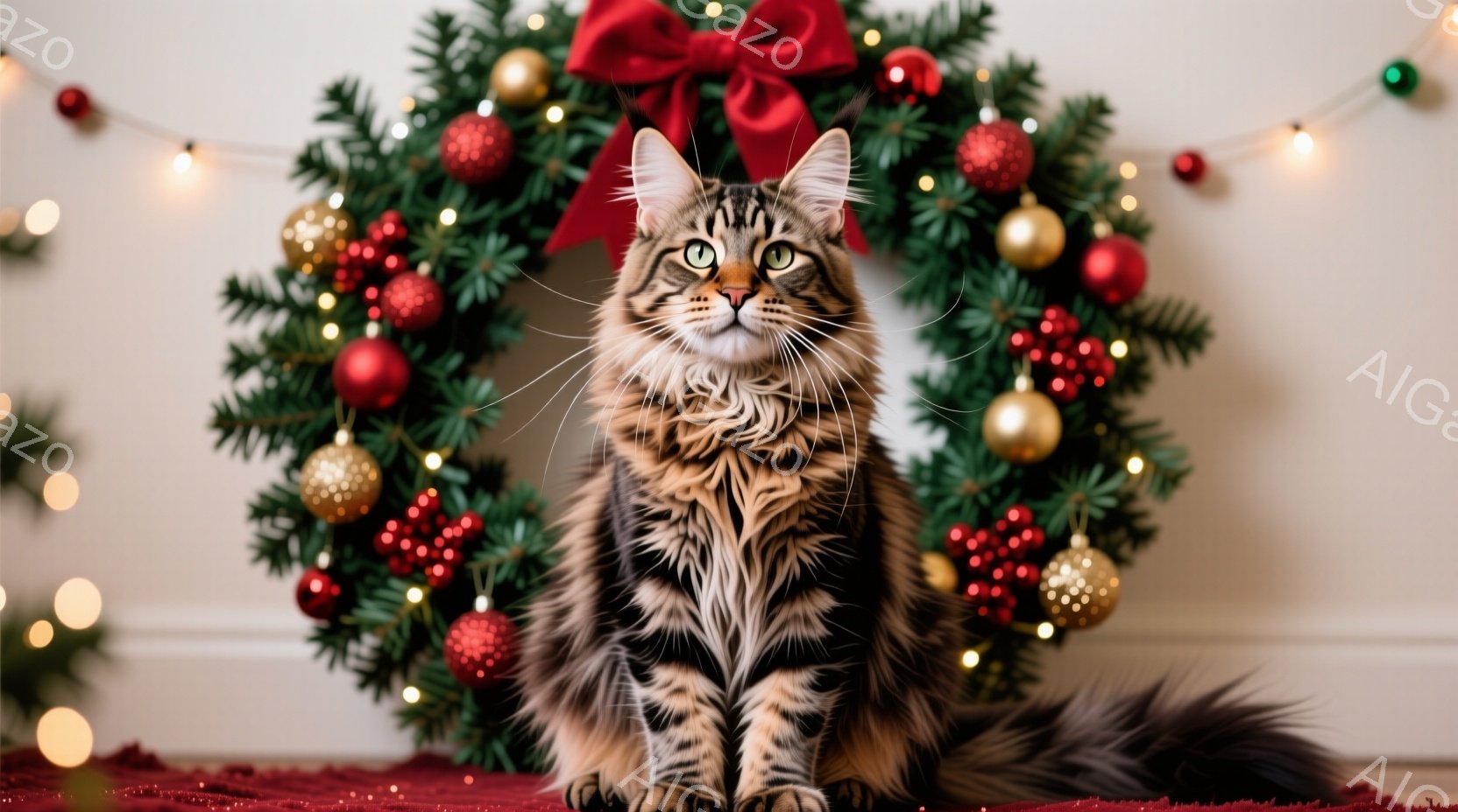 長毛のトラ柄の猫が赤い毛布の上に座っており、背景にはクリスマスリースと電飾が飾られています。猫は正面を見ており、落ち着いた表情で、ふさふさとした毛並みが特徴的です。全体的に暖かく、クリスマスの雰囲気を醸し出しています。