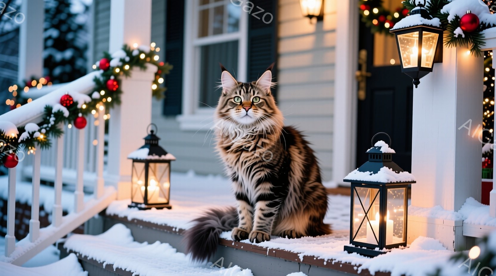縞模様の大きな猫が、雪で覆われた家の階段に座っています。背景にはクリスマスデコレーションが施された家があり、暖かみのある光が灯されたランタンが猫の周りに配置されています。雪が舞い降り、全体的に穏やかで温かい冬の雰囲気が漂っています。