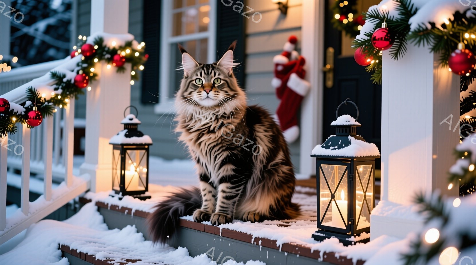 大きな縞模様の猫が、雪で覆われた家のバルコニーに座って正面を見つめています。背景には、クリスマスツリーの飾りと提灯が並び、暖かい光を放っています。雪景色と光のコントラストが、冬の暖かく穏やかな雰囲気を醸し出しています。