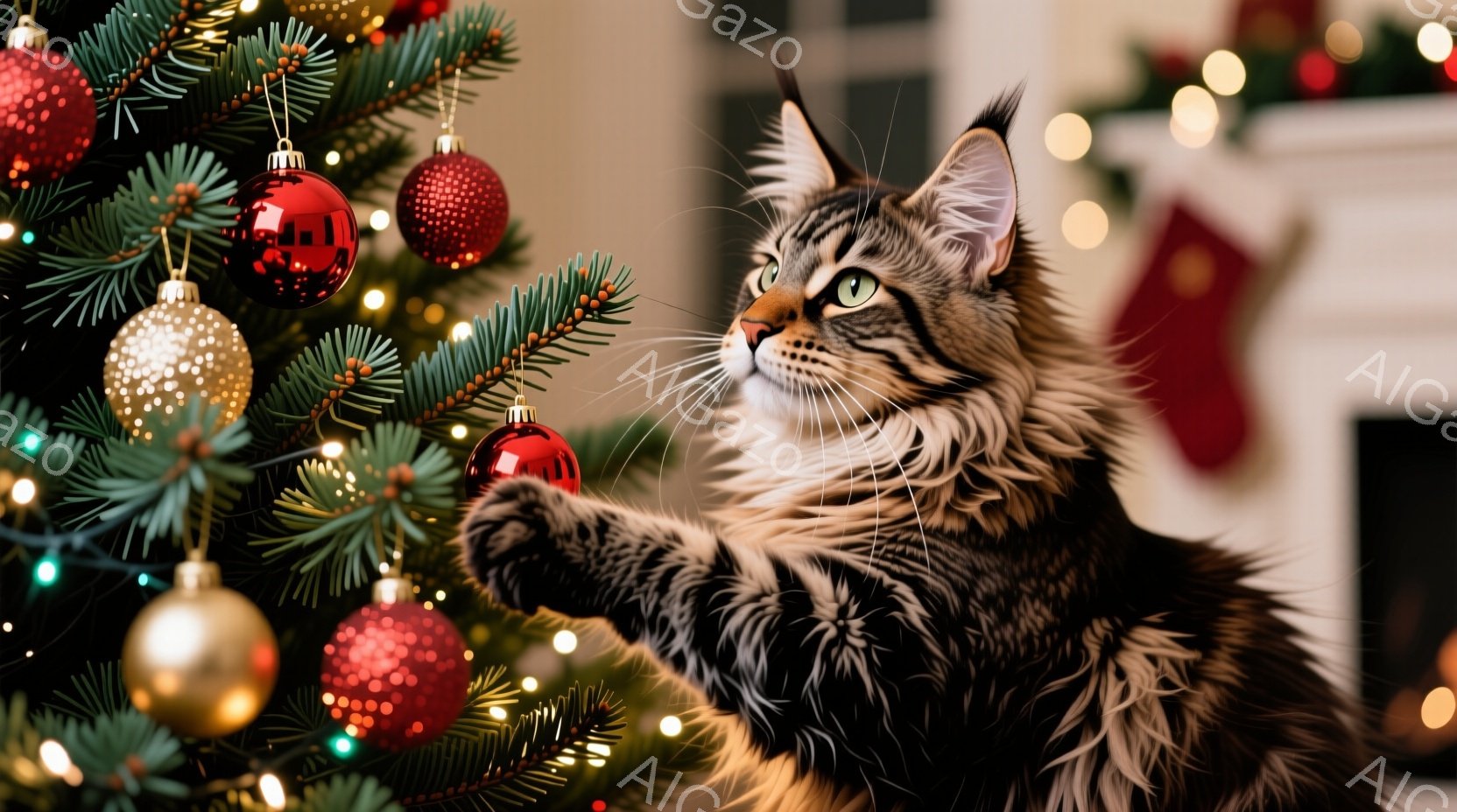 豪華なクリスマスツリーに大きな毛皮の猫がよじ登ろうとしている様子が写っています。猫は茶色と黒の縞模様で、緑色の瞳が印象的です。背景にはぼやけた光が散りばめられており、暖かくお祝いの雰囲気を醸し出しています。