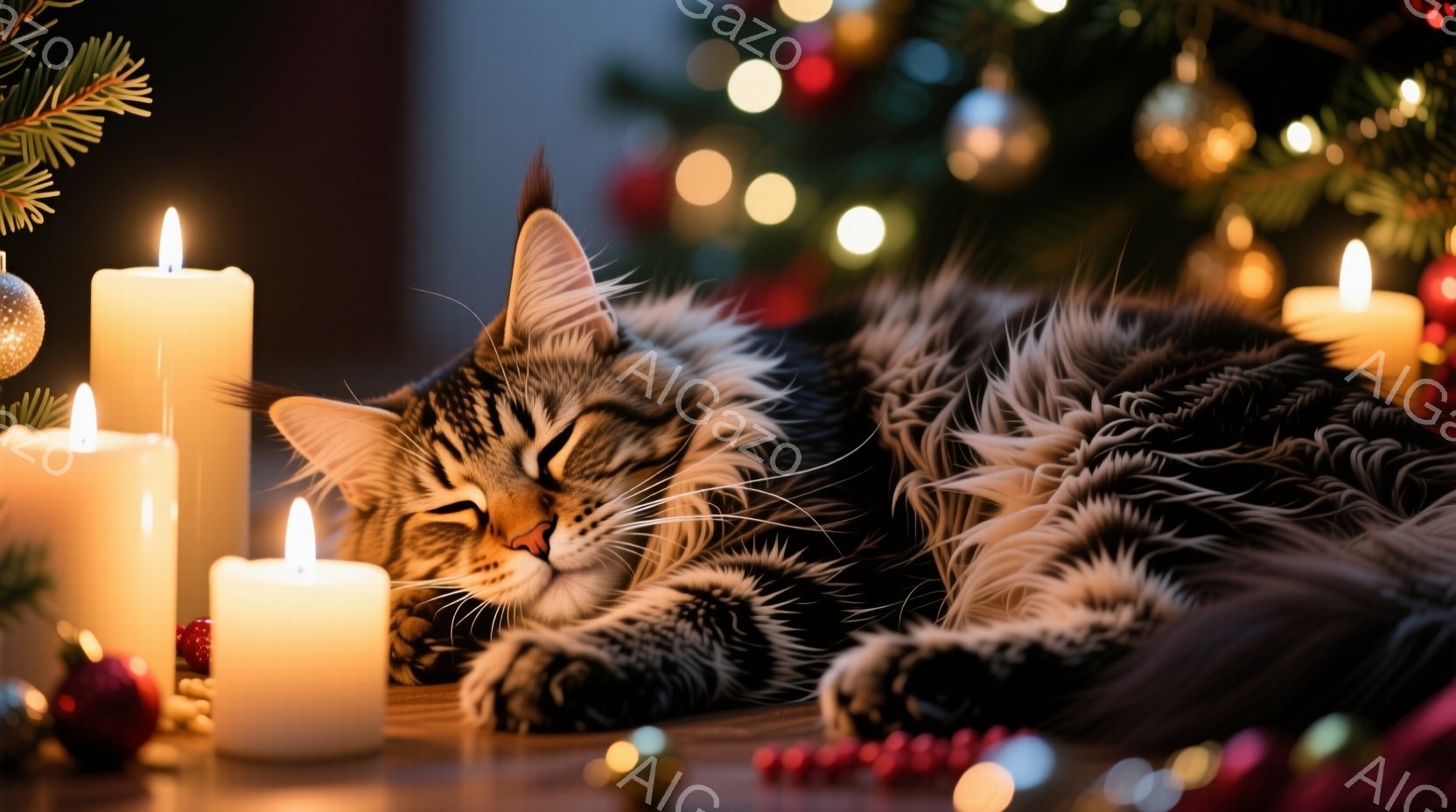 毛むくじゃらの縞模様の猫が、赤い背景の敷物の上で丸まって眠っています。周囲には点灯した白い柱状のキャンドルが配置され、背景にはぼやけたクリスマスツリーと装飾が散りばめられています。全体的に暖かく、安らかなクリスマスの雰囲気を醸し出しています。