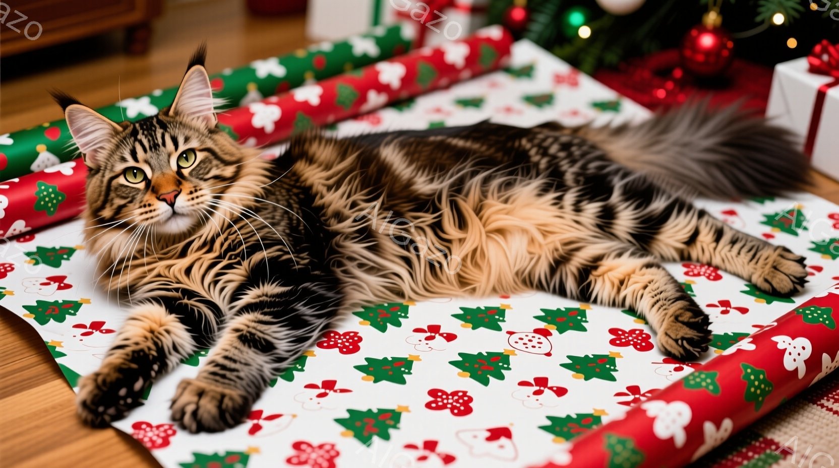 この無料AI生成画像「長毛のトラ柄の猫が、雪に覆われた木の柵の上で堂々と座っている。猫は前方をまっすぐ見つめ、少し厳しい表情で、まるで監視しているかのようだ。背景は雪景色で、ぼんやりと木々が見え、柵には温かい光を放つ電飾が飾られている。」は、2025年10月22日に作成されました。 サイズは 1664×928px の高解像度で、商用利用も可能なフリー素材として提供しています。