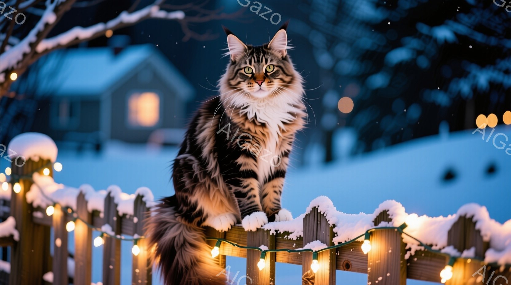 長い毛並みの大きな猫が、雪が積もった木の柵の上に座っています。背景は雪景色で、小さな電飾が柵に巻き付けられ、暖かい光を放っています。猫は正面を向き、緑色の瞳でカメラを見つめており、堂々とした雰囲気を漂わせています。