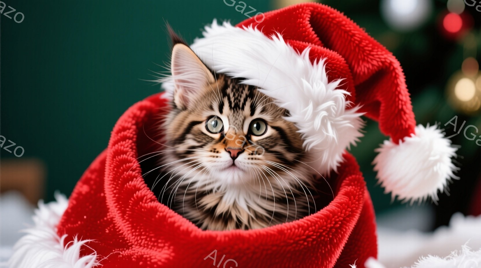 白と黒の縞模様の小さな子猫が、赤いサンタの帽子にすっぽり収まってこちらを見ています。子猫は丸い瞳で好奇心旺盛な表情をしており、前足は可愛らしく帽子から覗いています。背景には緑色のクリスマスツリーとぼやけた光のぼかしがあり、温かくお祝いムードに満ちています。