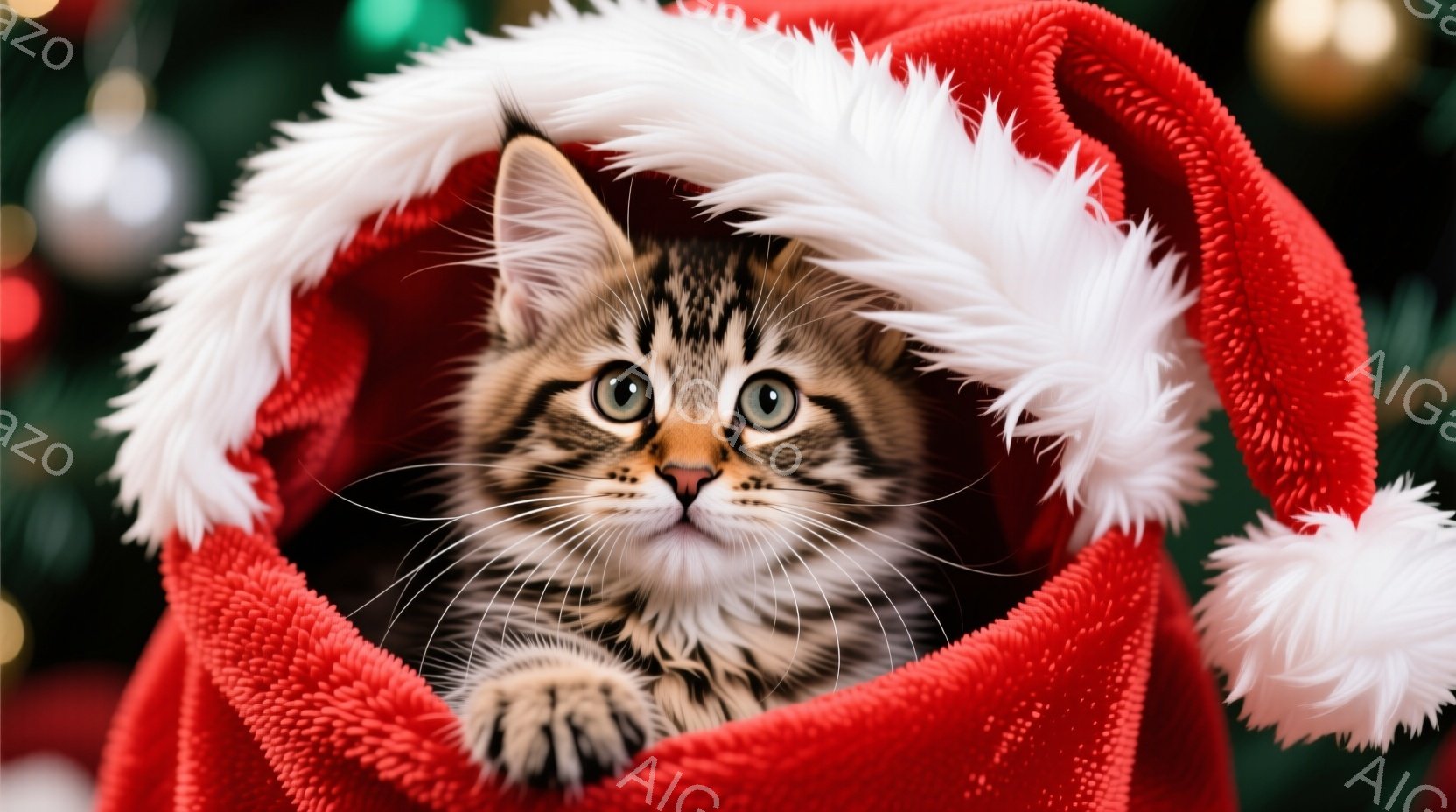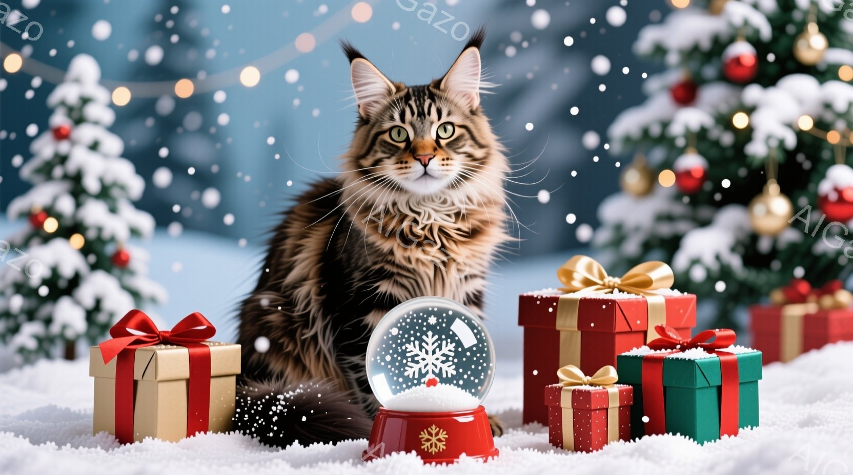 長毛のトラ猫が雪の上に座り、正面を見つめている。周囲には緑と赤のリボンで飾られたプレゼントボックスと、雪景色を閉じ込めたスノーグローブが置かれている。背景にはぼやけたクリスマスツリーが輝き、全体的に温かく、祝祭的な雰囲気を醸し出している。