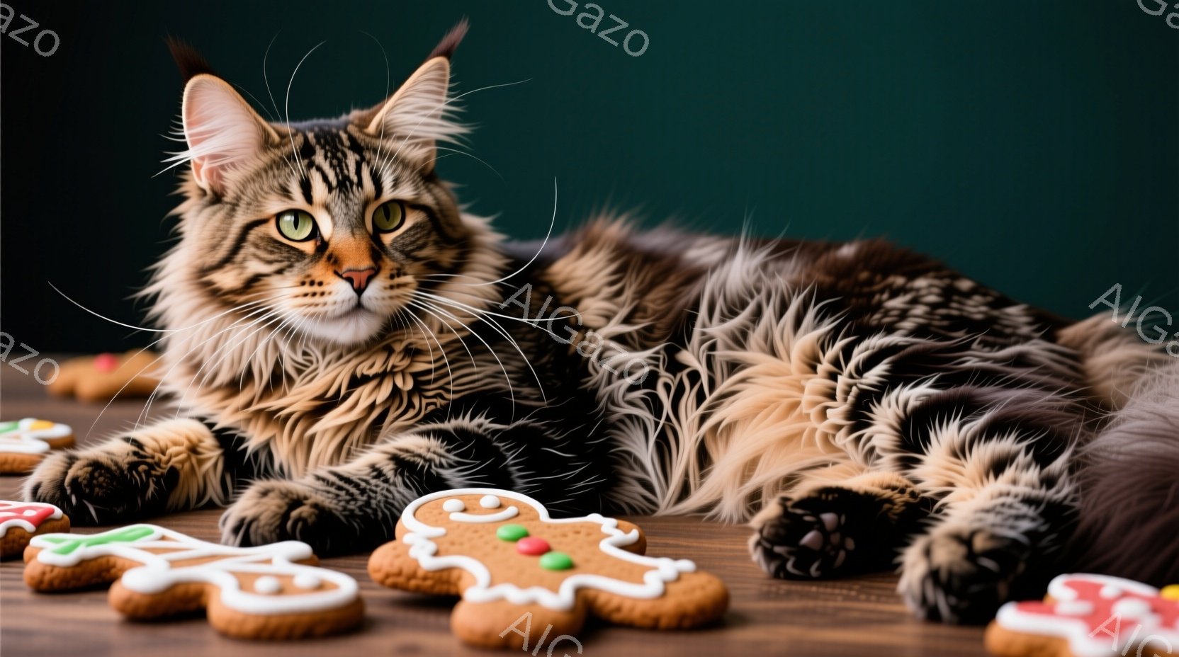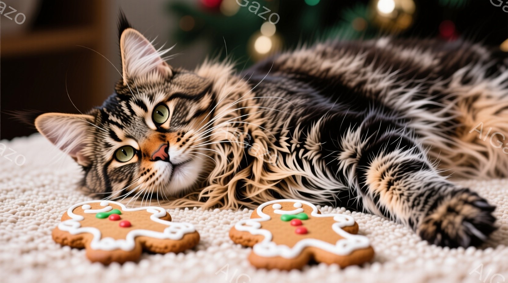 長毛のトラ柄の猫が白い毛布の上に横たわっており、まるで王様のように堂々とした姿勢をとっています。猫の周りには、アイシングで飾られたジンジャーブレッドマンのクッキーが数個置かれており、クリスマスの背景には飾り付けられたクリスマスツリーが見えます。暖色系の照明と毛布の白さが合わさり、温かく、穏やかなクリスマスの雰囲気を醸し出しています。