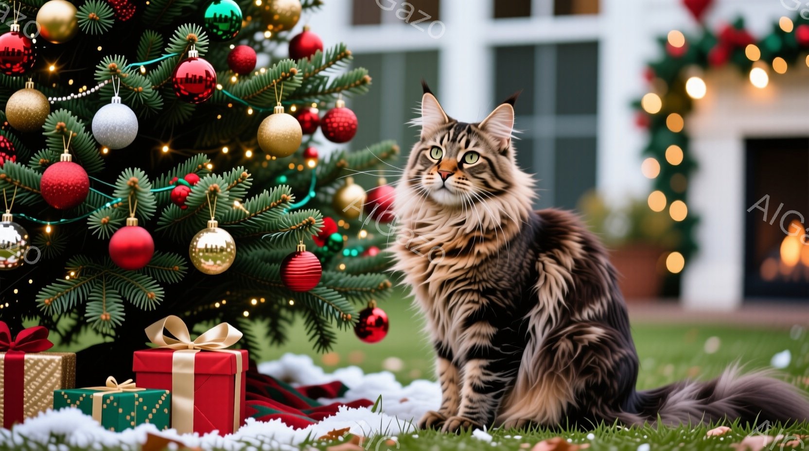 縞模様の大きな猫が、クリスマスツリーの近くの芝生に座っています。ツリーは金と赤のオーナメントで飾られ、プレゼントがいくつか置かれています。背景にはぼやけた家や庭が見え、暖かくお祝いの雰囲気が漂っています。