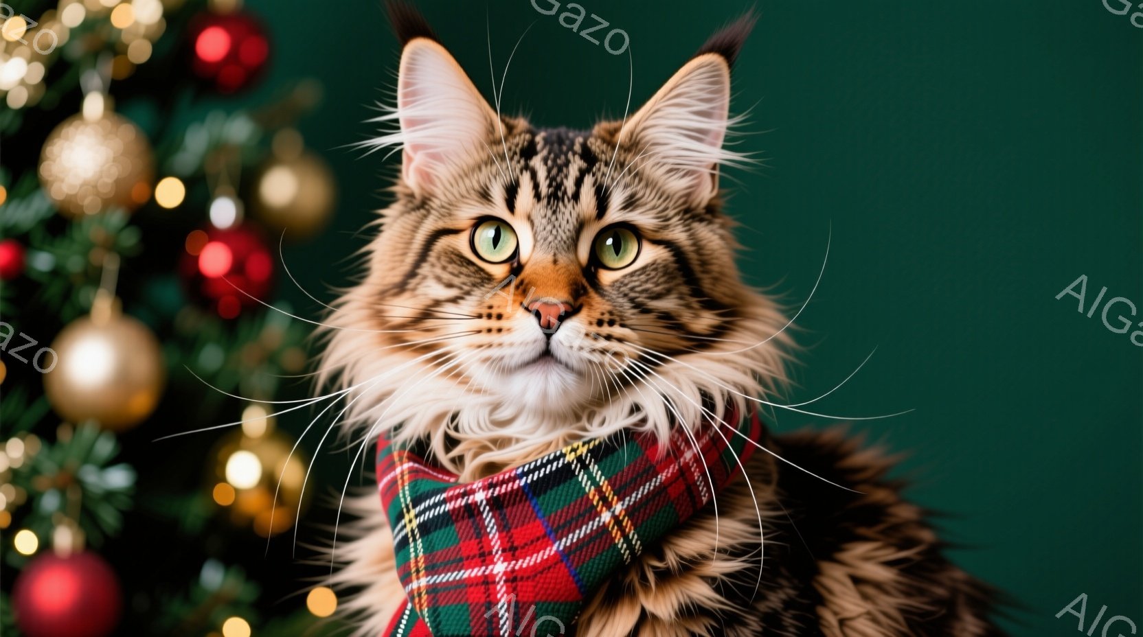 長毛の猫が、赤、緑、白のチェック柄の暖かいスカーフを首に巻いて正面を見つめています。猫は琥珀色の目を持ち、ふわふわとした毛並みと長いヒゲが特徴的です。背景には、ぼやけたクリスマスツリーと、キラキラと輝くぼかしの光が散りばめられており、温かくお祝いムードを醸し出しています。
