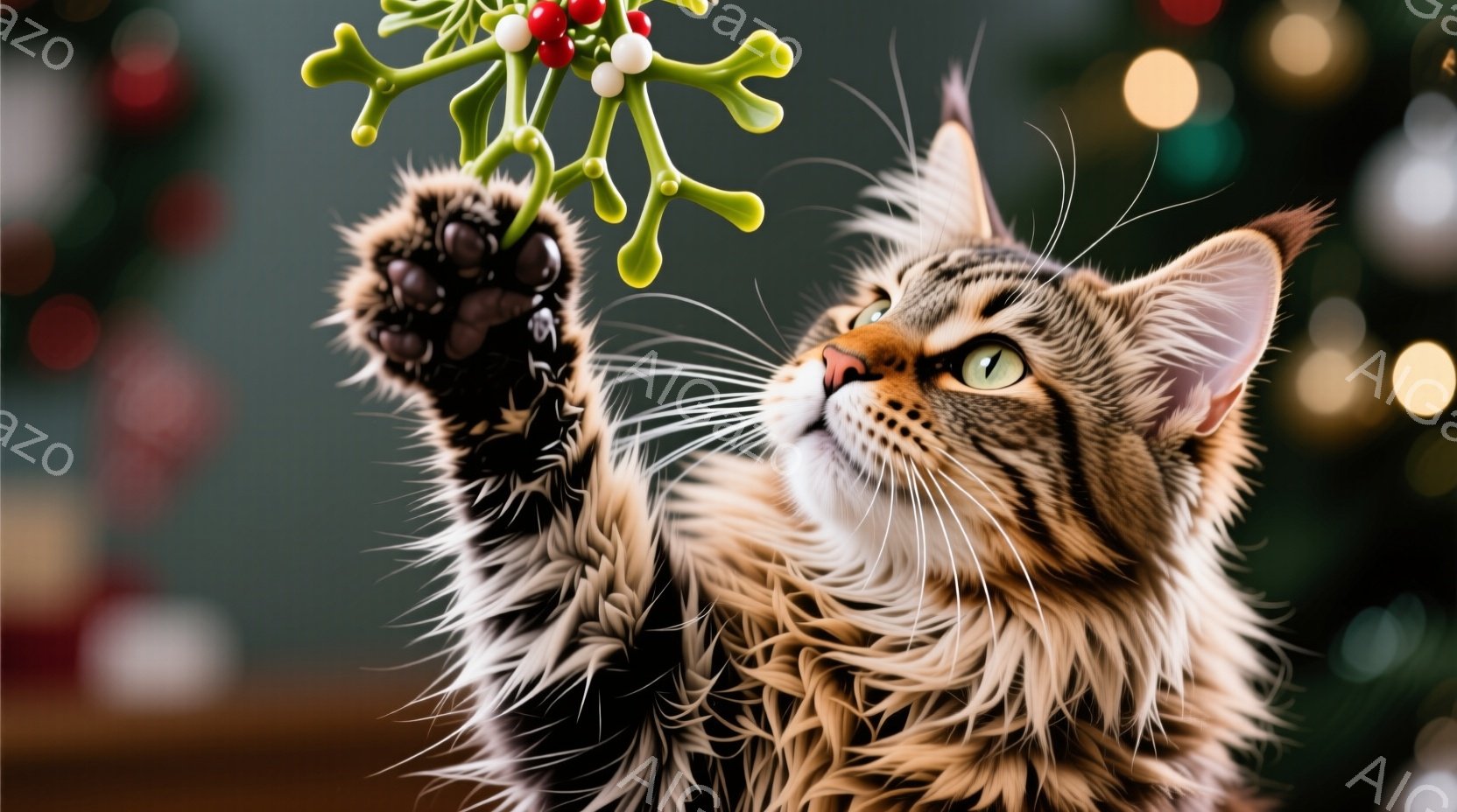 長毛の猫がミステルトーの上に手を伸ばしている様子が写っている。猫は明るい茶色の毛並みで、緑色の瞳が印象的だ。背景にはぼやけた緑色の光と、暖かみのある黄色の光が散りばめられており、クリスマスの雰囲気を醸し出している。