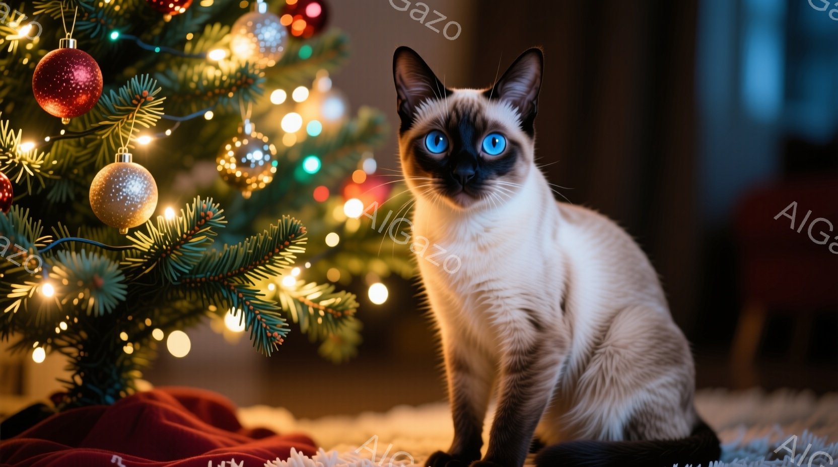 シーラムカラーの猫が、白いカーペットの上に横たわってこちらを見つめています。背景にはクリスマスツリーがぼんやりと見え、暖かく幻想的な雰囲気を醸し出しています。猫の青い瞳が印象的で、優雅さと落ち着きを感じさせます。