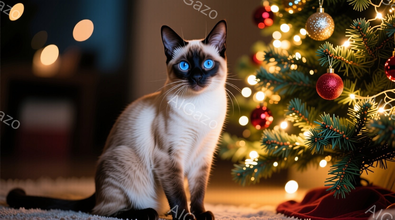 この無料AI生成画像「シーラムポイントの猫が、赤いサンタの帽子を頭に乗せて正面を見つめています。鮮やかな青い目が印象的で、少し驚いたような、または興味津々な表情をしています。背景は深い緑色で、猫の毛色と目が際立っています。」は、2025年10月22日に作成されました。 サイズは 1664×928px の高解像度で、商用利用も可能なフリー素材として提供しています。
