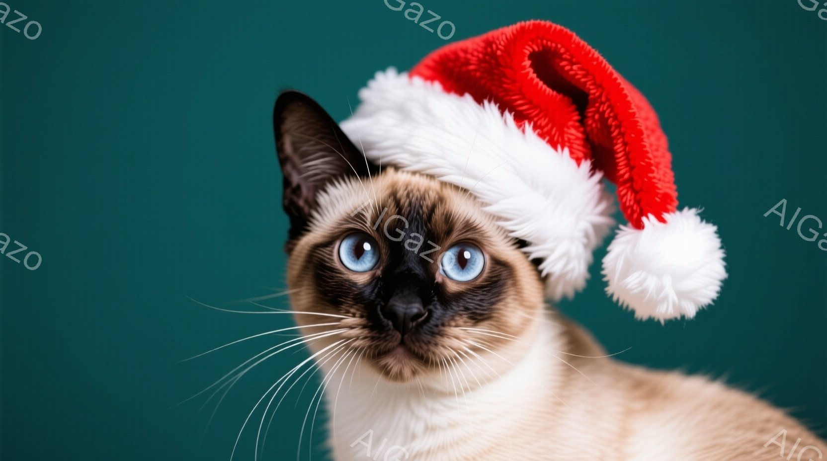 シーマーズ猫が、クリスマス風の赤い帽子を頭に乗せて正面を見つめている。鮮やかな青い目が印象的で、少しいたずらっぽい表情をしている。背景は深緑色で、猫の毛色とコントラストがはっきりしている。