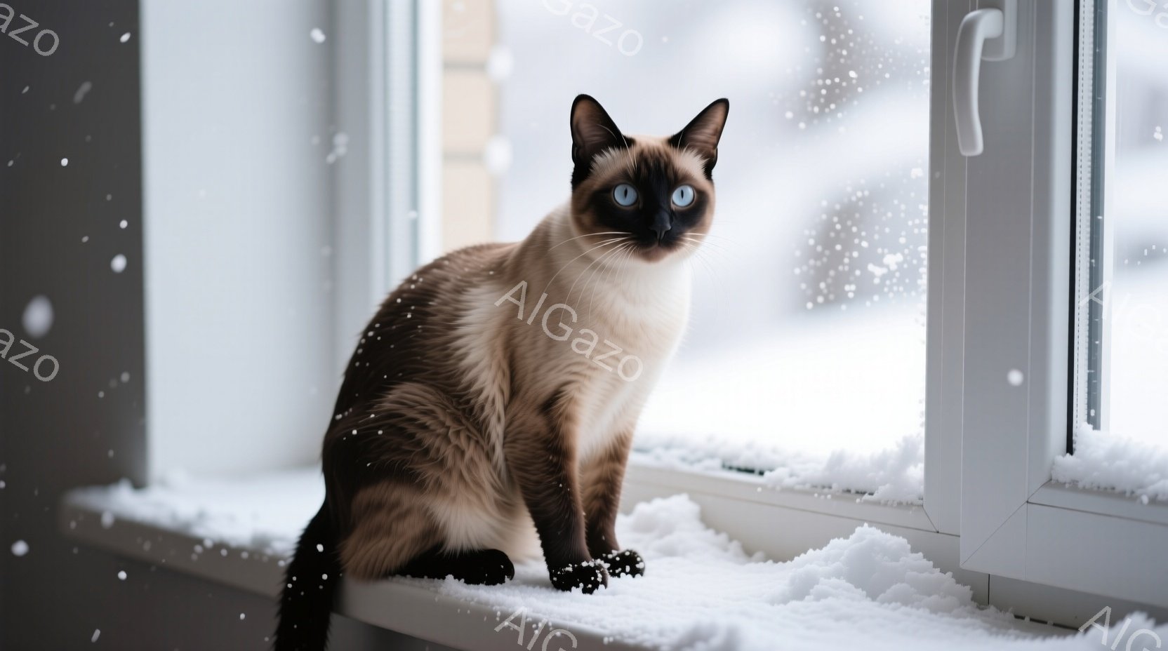シーラ猫が雪の積もった窓枠に座って外を眺めている。猫は美しいブルーの目をしており、クリーム色の毛並みと濃い色のポイントが特徴的だ。背景は雪景色で、寒く静かな冬の雰囲気が伝わってくる。