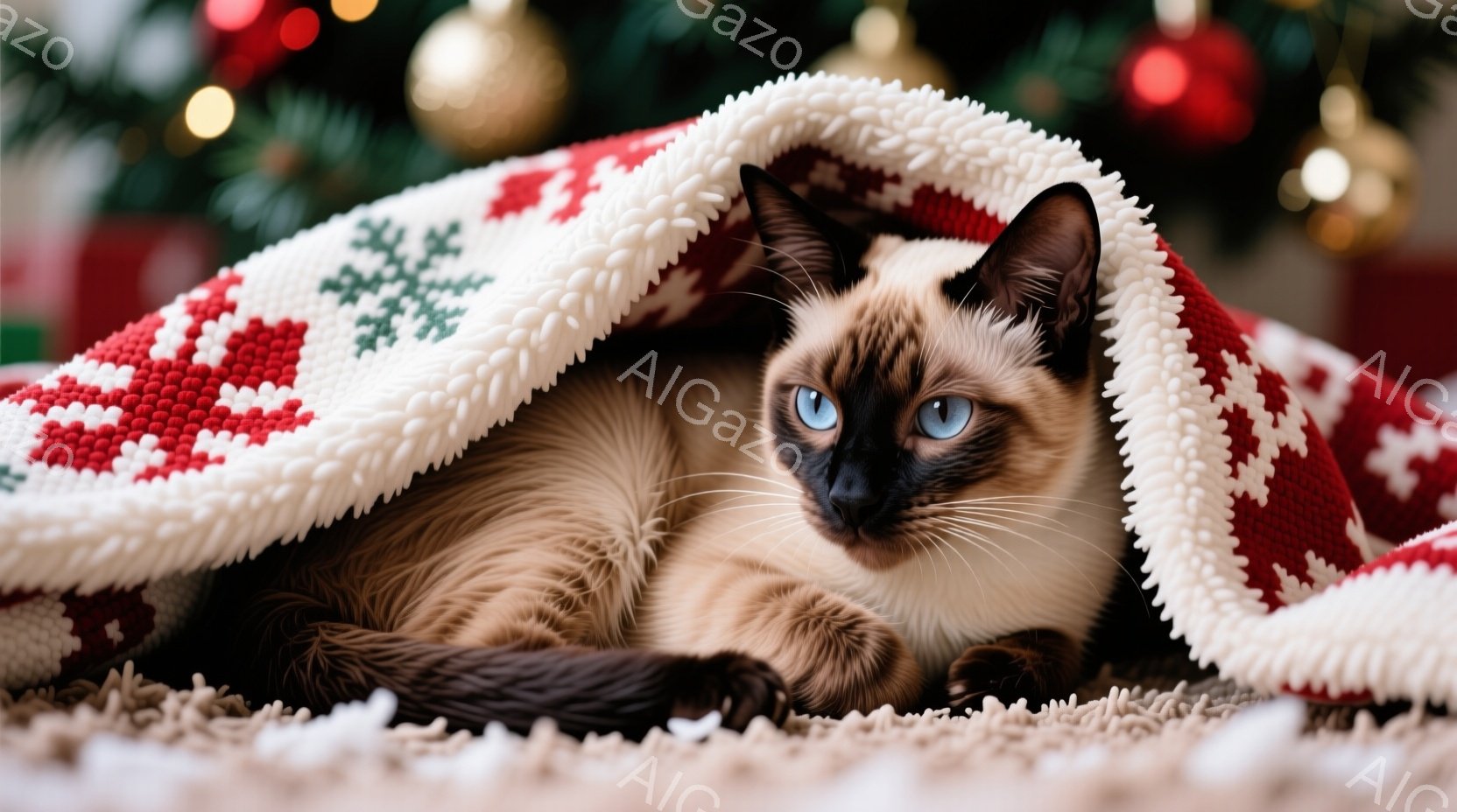 シーマーズ猫が赤い毛布に包まれてリラックスして横たわっています。その猫はポイントカラーで、鮮やかな青い目が印象的です。背景にはぼやけたクリスマスツリーの飾りが見え、暖かく心地よい雰囲気を醸し出しています。
