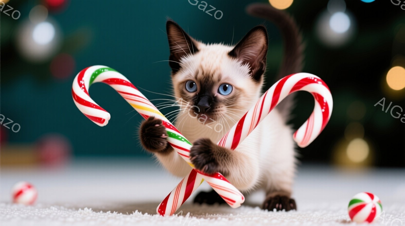 この無料AI生成画像「シーマ模様の愛らしい子猫が、赤いストライプと緑のストライプが入ったキャンディケーンを前足で抱えています。子猫は青い目を大きく見開き、少しいたずらっぽい表情を浮かべています。背景は明るい水色で、周りにはキャンディケーンが散らばり、全体的に遊び心のある、陽気な雰囲気を醸し出しています。」は、2025年10月22日に作成されました。 サイズは 1664×928px の高解像度で、商用利用も可能なフリー素材として提供しています。