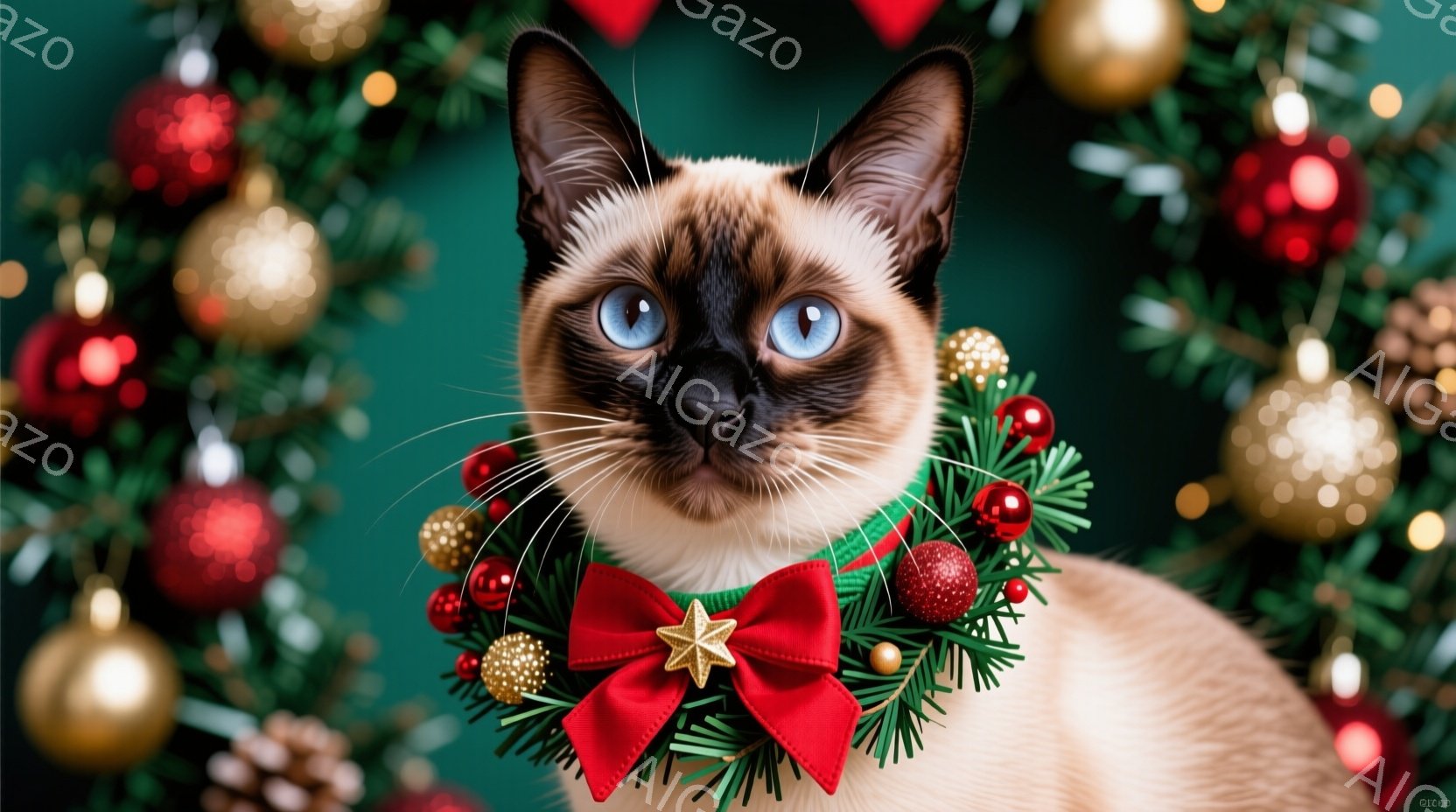 この無料AI生成画像「シーマン猫がクリスマス風の首輪をつけて正面を見つめている。猫は明るいクリーム色の毛並みで、ポイントカラーが特徴的だ。背景にはぼやけたクリスマスオーナメントの光が散りばめられ、暖かくお祝いの雰囲気を作り出している。」は、2025年10月22日に作成されました。 サイズは 1664×928px の高解像度で、商用利用も可能なフリー素材として提供しています。