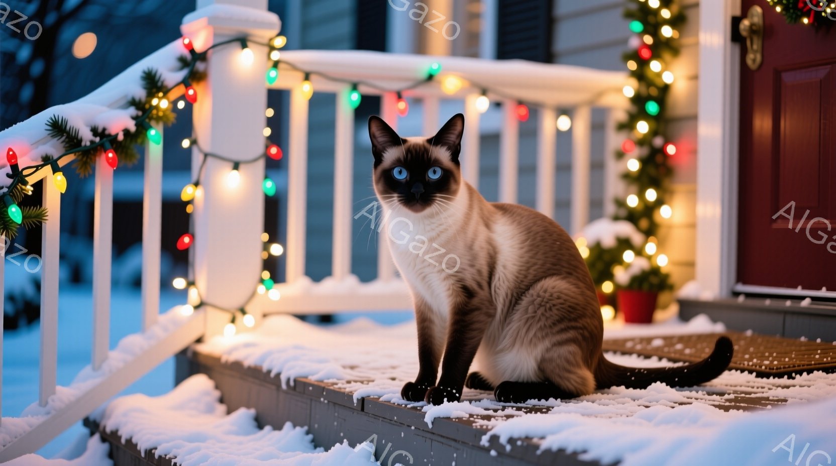 シナモン色の毛並みにポイントで濃い茶色の耳と足を持つシャム猫が雪の積もった家の外階段に座っています。猫は正面を見ており、落ち着いた表情で、少し好奇心旺盛な様子です。背景にはクリスマスイルミネーションが飾られ、雪景色と相まって暖かく幻想的な雰囲気を醸し出しています。