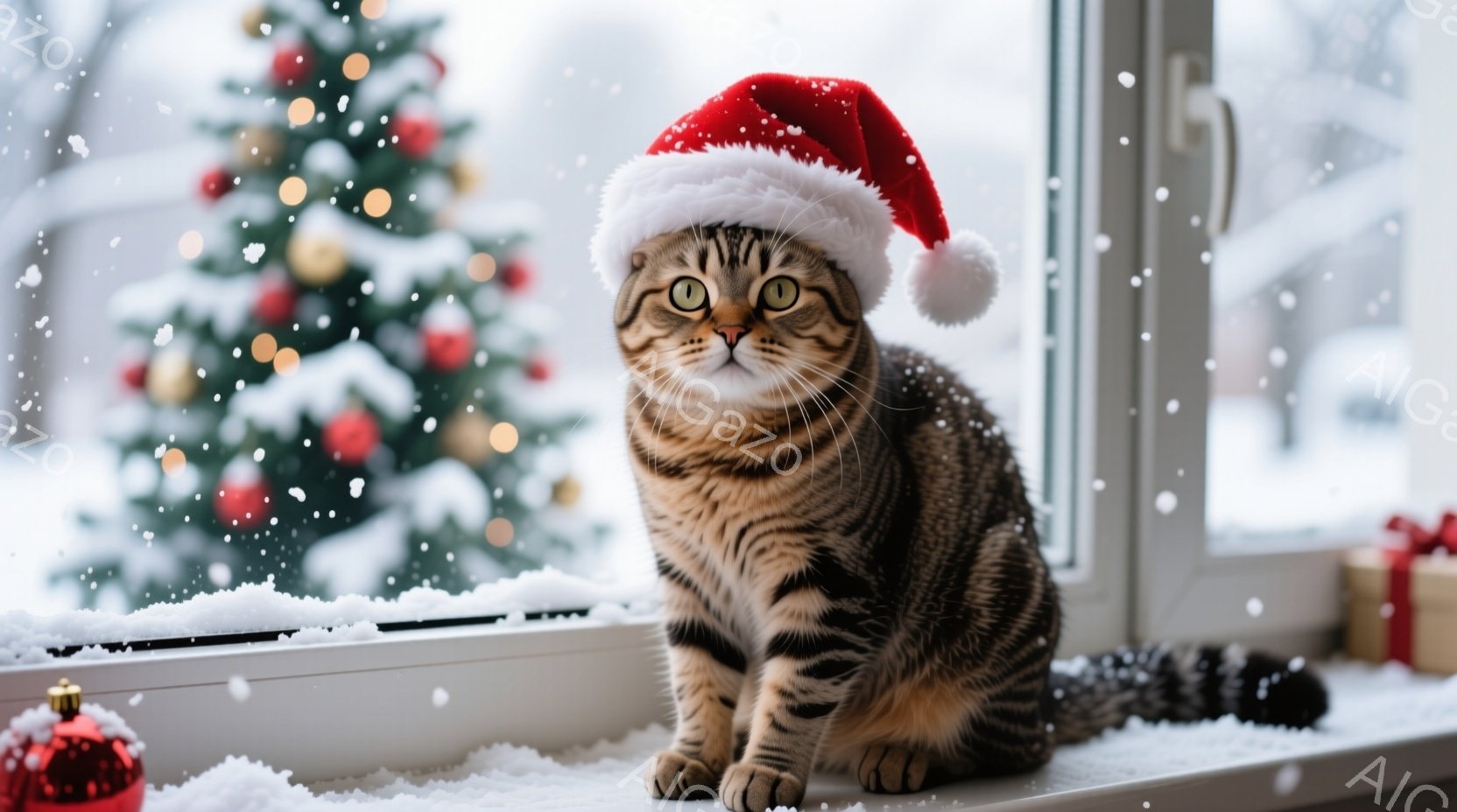 縞模様の猫が赤いサンタ帽をかぶり、窓枠に座ってこちらを見ています。背景にはぼやけたクリスマスツリーと雪景色が広がり、穏やかで温かいクリスマスの雰囲気が漂っています。猫の表情は少しいたずらっぽく、冬の暖炉のそばでリラックスした様子が想像できます。